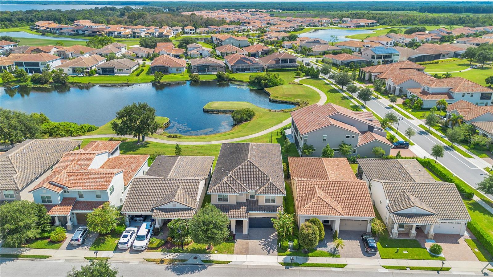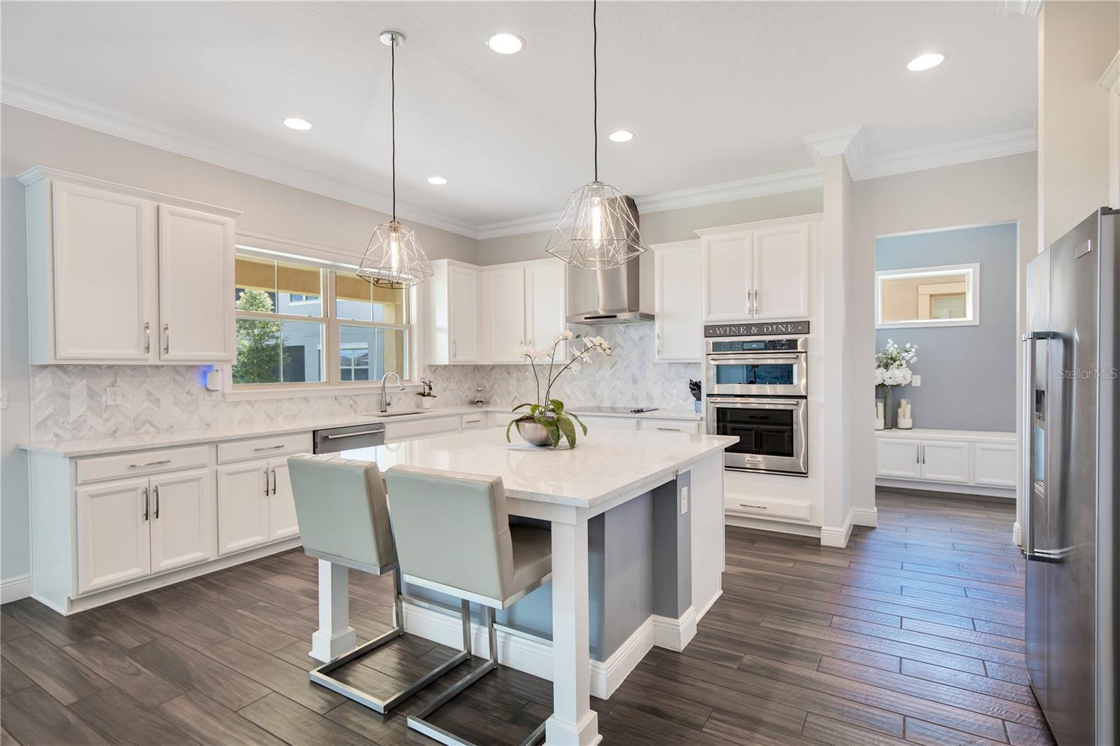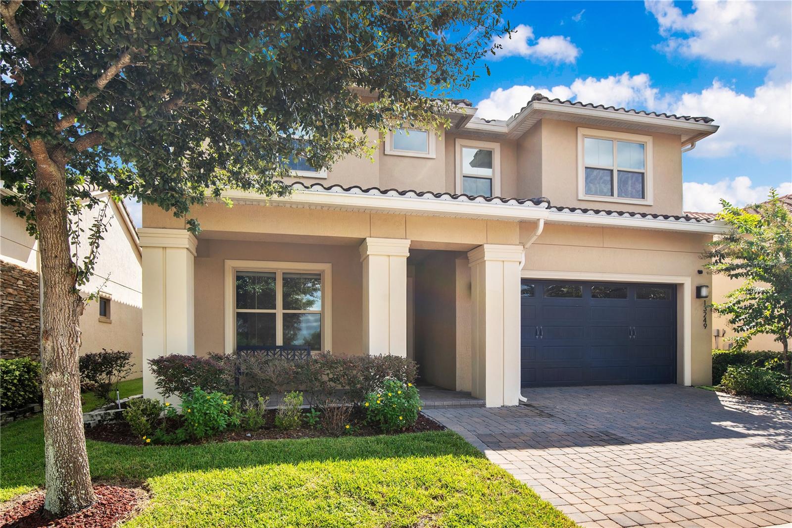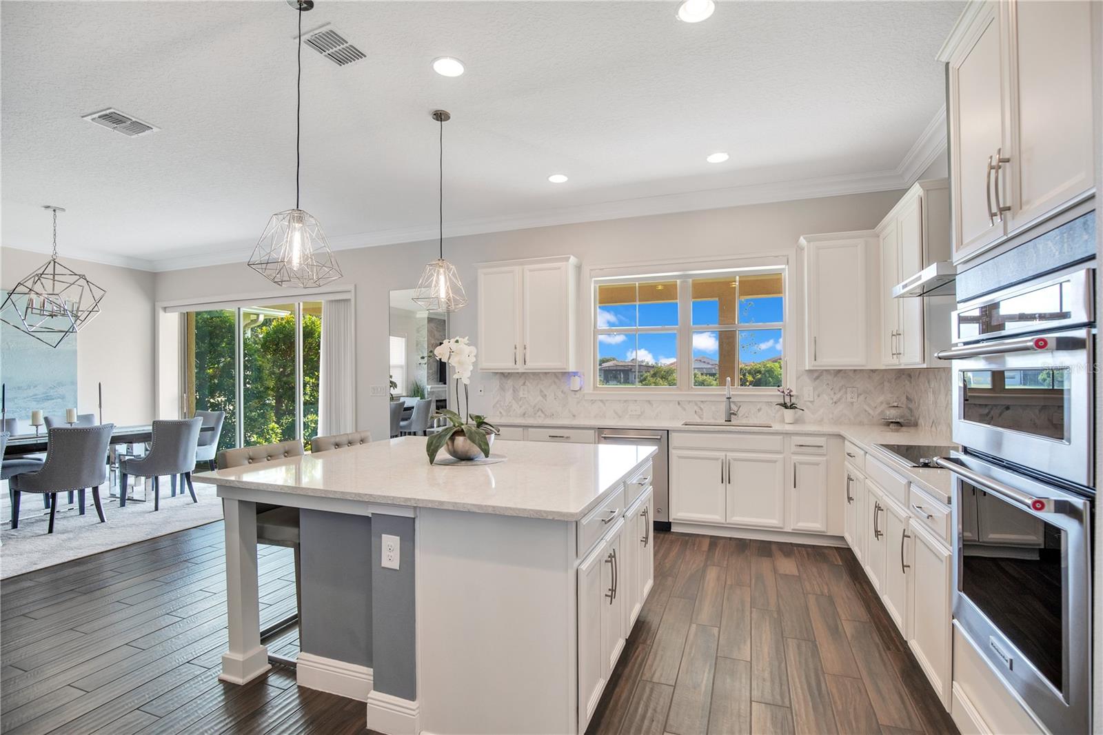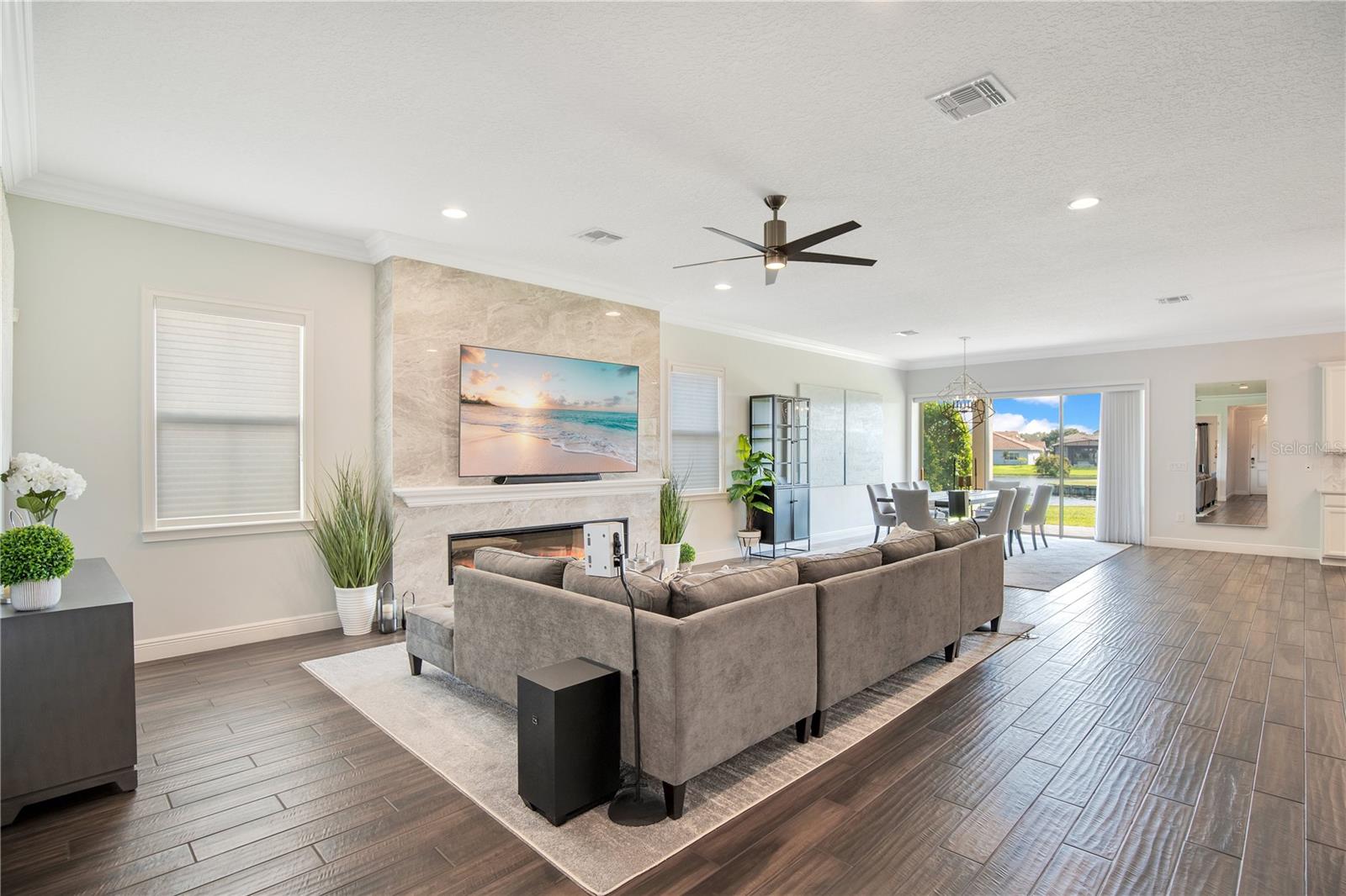 Welcome to 13249 Woodford Street, where luxury living meets thoughtful design. This stunning 4-bedroom, 4-bathroom residence offers elegant finishes, expansive living spaces, and serene pond views in one of Orlando’s most sought-after communities. From the moment you step into the foyer, this home makes an impression. The wood-look tile flooring is both beautiful and practical—durable, water-resistant, and virtually maintenance-free. At the heart of the home, an open family room, kitchen, and dining area set the stage for effortless living and entertaining. The chef’s dream kitchen is as functional as it is stylish, featuring top-of-the-line KitchenAid appliances, quartz countertops, an oversized island with seating, 48-inch cabinetry, tile backsplash, and abundant storage with a large walk-in pantry! The island provides space for baking or entertaining, while still offering casual seating for quick meals. Just off the kitchen, a full bath has been thoughtfully designed with future pool living in mind. The separate dining area, flowing between the kitchen and family room, accommodates a large table with ease, making holidays and dinner parties a joy. From here, sliding glass doors lead to a covered lanai that spans the entire width of the home. Facing east, this incredible outdoor living space captures peaceful sunrises and stays shaded through the afternoon and evening, allowing you to relax or entertain comfortably year-round. The family room shines with a custom tiled entertainment wall, complete with an electric fireplace and a designated space for your wall-mounted TV. A separate dry bar area adds both storage and function with counter space, cabinetry, and a beverage refrigerator—perfect for gatherings. A downstairs bedroom with ensuite full bath is ideal for guests or a private home office. Head upstairs to a spacious loft with two sets of sliding glass doors for exceptional views. These doors open up onto the full-length screened balcony with Polywood flooring. Overlooking the tranquil pond, this space provides an incredible extension of your living area—perfect for morning coffee at sunrise or shaded afternoons and evenings spent outdoors, maybe even catching a rocket launch from Cape Canaveral. The primary suite is an oversized retreat with slider doors opening to the balcony water view. Its spa-inspired bath offers dual sinks, a custom walk-in shower with rain head, and a separate water closet. An bonus feature in the bathroom is a vanity island, blending luxury and practicality, with added storage and counter space! Dual walk-in closets between the bedroom and bathroom are convenient and provide more privacy and ease of dressing. Two additional upstairs bedrooms and a full bath complete the perfect family layout. The secondary bathroom upstairs has dual sinks and a shower/tub combination. All showers in the home feature tiled walls all the way from the floor to the ceiling. The laundry room is upstairs with a sink and cabinet/countertop space making folding clothing easy. Additional highlights include high ceilings with 8-foot doors throughout, a 3-car garage (one tandem, ideal for storage, golf cart storage, or a home gym), a convenient drop zone at the garage entry with low cabinets and regular height cabinets, and a water filtration system serving the entire home! Check out the Matterport 3-D link to see this home NOW! It offers it all—style, function, and a setting you’ll fall in love with.