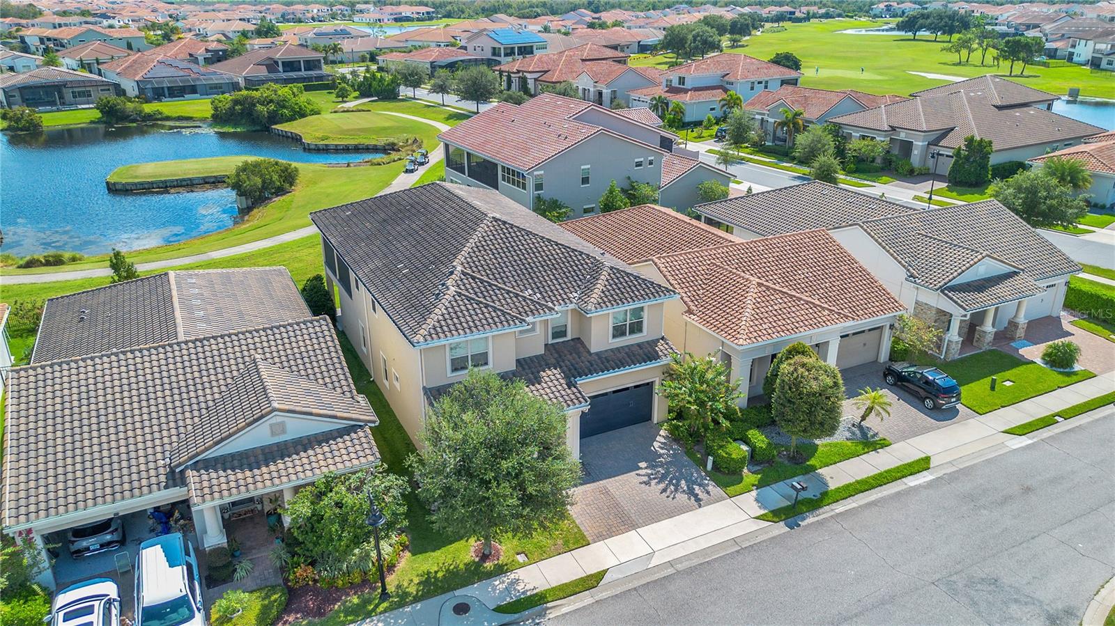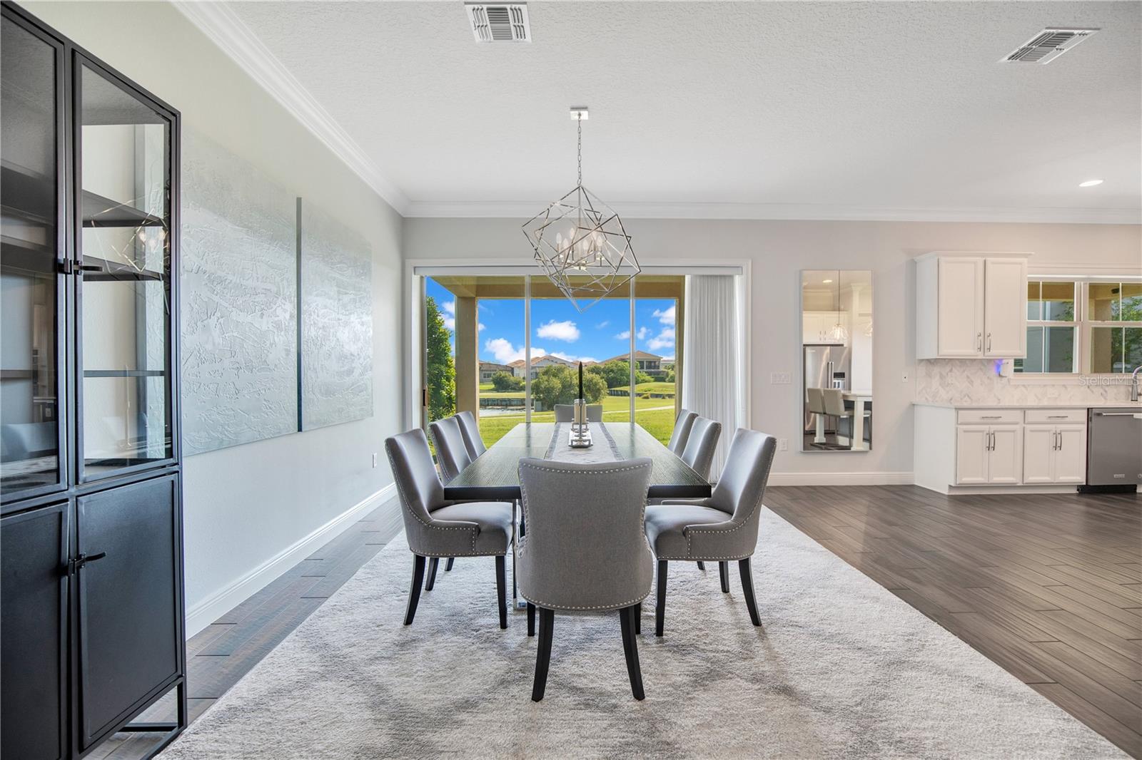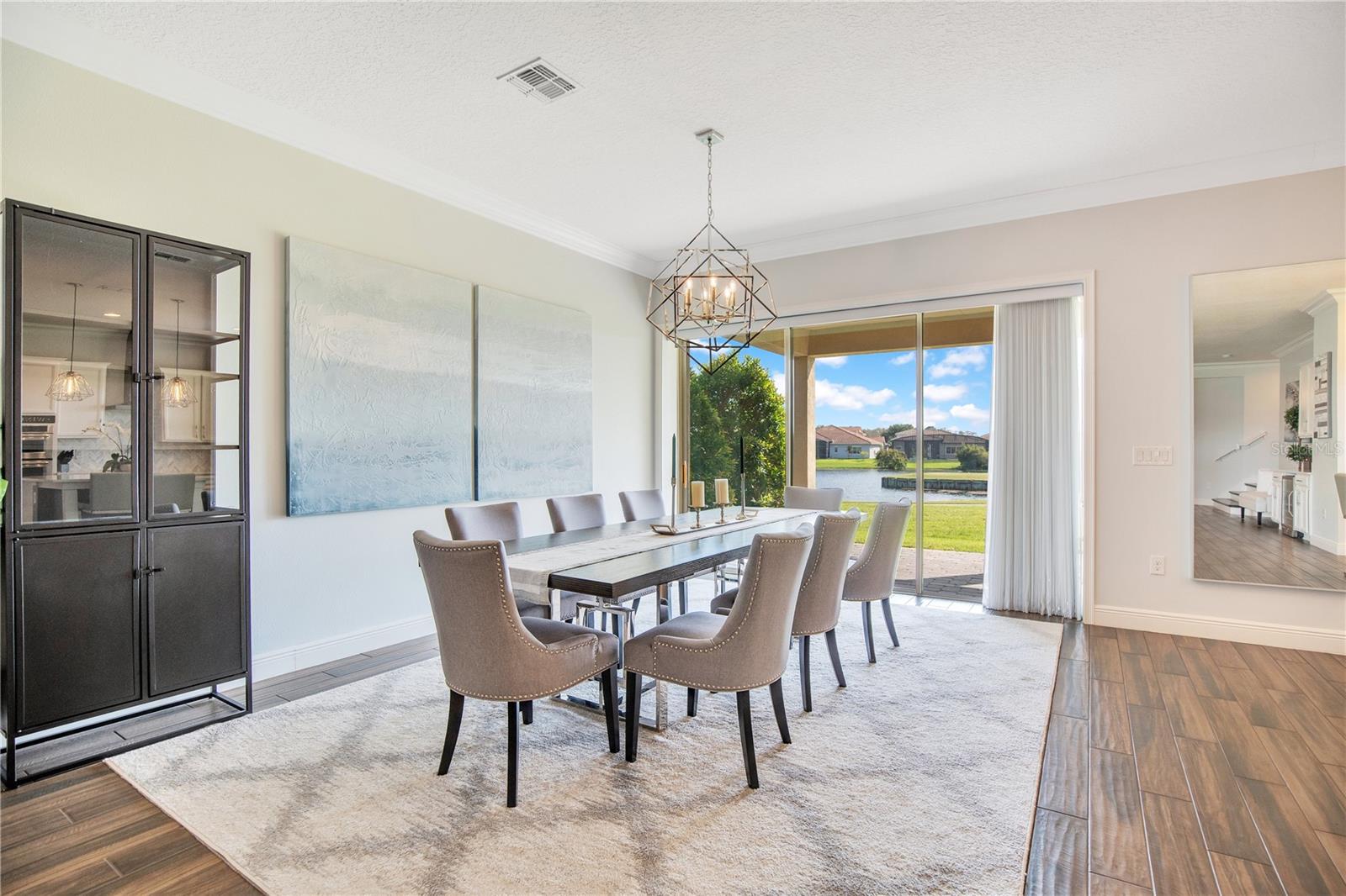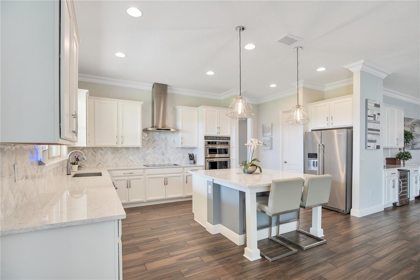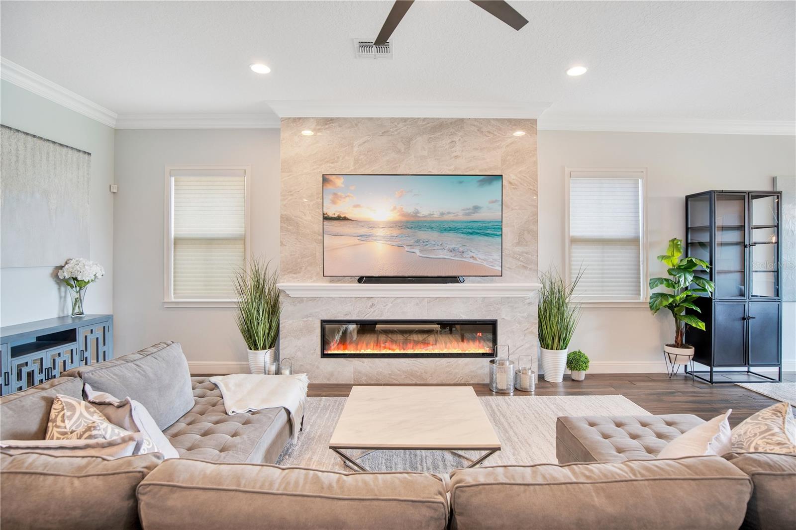 Welcome to 13249 Woodford Street, where luxury living meets thoughtful design. This stunning 4-bedroom, 4-bathroom residence offers elegant finishes, expansive living spaces, and serene pond views in one of Orlando’s most sought-after communities. From the moment you step into the foyer, this home makes an impression. The wood-look tile flooring is both beautiful and practical—durable, water-resistant, and virtually maintenance-free. At the heart of the home, an open family room, kitchen, and dining area set the stage for effortless living and entertaining. The chef’s dream kitchen is as functional as it is stylish, featuring top-of-the-line KitchenAid appliances, quartz countertops, an oversized island with seating, 48-inch cabinetry, tile backsplash, and abundant storage with a large walk-in pantry! The island provides space for baking or entertaining, while still offering casual seating for quick meals. Just off the kitchen, a full bath has been thoughtfully designed with future pool living in mind. The separate dining area, flowing between the kitchen and family room, accommodates a large table with ease, making holidays and dinner parties a joy. From here, sliding glass doors lead to a covered lanai that spans the entire width of the home. Facing east, this incredible outdoor living space captures peaceful sunrises and stays shaded through the afternoon and evening, allowing you to relax or entertain comfortably year-round. The family room shines with a custom tiled entertainment wall, complete with an electric fireplace and a designated space for your wall-mounted TV. A separate dry bar area adds both storage and function with counter space, cabinetry, and a beverage refrigerator—perfect for gatherings. A downstairs bedroom with ensuite full bath is ideal for guests or a private home office. Head upstairs to a spacious loft with two sets of sliding glass doors for exceptional views. These doors open up onto the full-length screened balcony with Polywood flooring. Overlooking the tranquil pond, this space provides an incredible extension of your living area—perfect for morning coffee at sunrise or shaded afternoons and evenings spent outdoors, maybe even catching a rocket launch from Cape Canaveral. The primary suite is an oversized retreat with slider doors opening to the balcony water view. Its spa-inspired bath offers dual sinks, a custom walk-in shower with rain head, and a separate water closet. An bonus feature in the bathroom is a vanity island, blending luxury and practicality, with added storage and counter space! Dual walk-in closets between the bedroom and bathroom are convenient and provide more privacy and ease of dressing. Two additional upstairs bedrooms and a full bath complete the perfect family layout. The secondary bathroom upstairs has dual sinks and a shower/tub combination. All showers in the home feature tiled walls all the way from the floor to the ceiling. The laundry room is upstairs with a sink and cabinet/countertop space making folding clothing easy. Additional highlights include high ceilings with 8-foot doors throughout, a 3-car garage (one tandem, ideal for storage, golf cart storage, or a home gym), a convenient drop zone at the garage entry with low cabinets and regular height cabinets, and a water filtration system serving the entire home! Check out the Matterport 3-D link to see this home NOW! It offers it all—style, function, and a setting you’ll fall in love with.