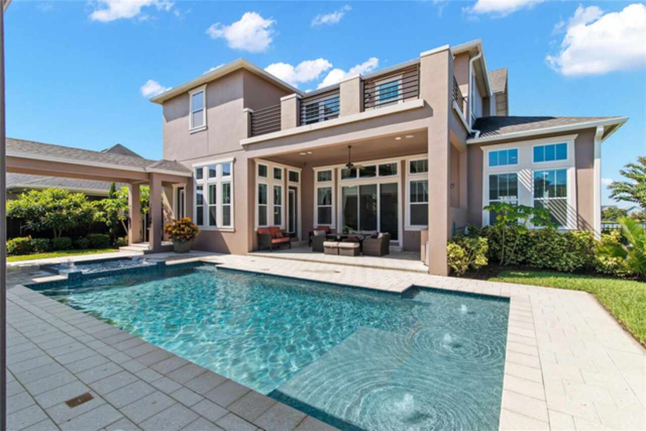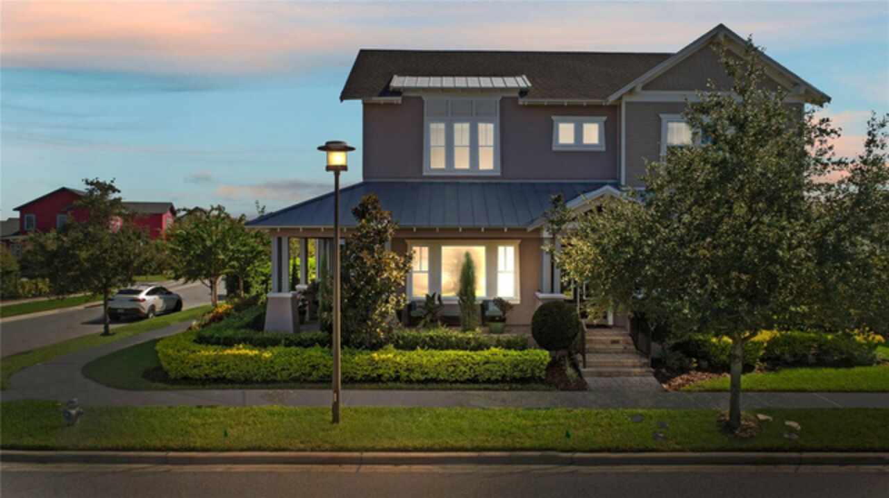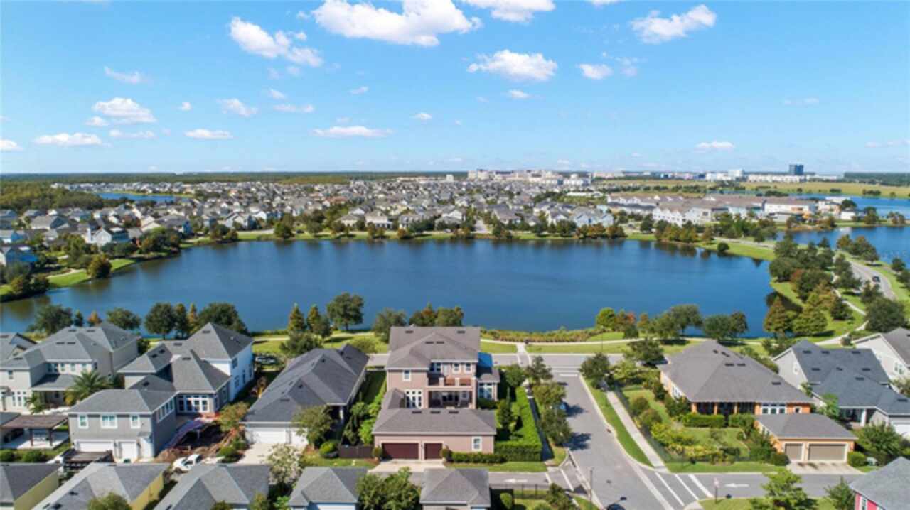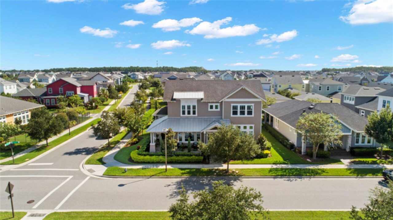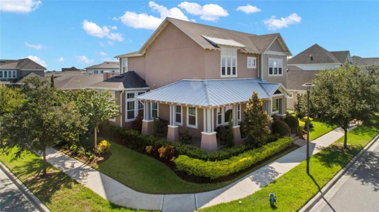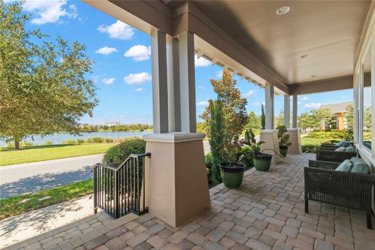 This luxurious estate home in Laureate Park/Lake Nona sits on an oversized corner lot (77 Ft Front) on Square Lake. Enjoy the fantastic views and gorgeous sunsets every day from your own extended covered front porch. Totaling 4, 650 square feet with 5 bedrooms and 4.5 baths, this impressive home features so many high-end upgrades that you feel as though you are living in a model home. From the beautiful porcelain tile on the first floor to the extraordinary wood beams in Formal Living, Great Room, Dining Room and Sunroom, you will see the dedication and love put into this home. The gourmet kitchen features two custom islands, double stack kitchen cabinets, gas appliances, double build-in fridge, butler’s pantry with wine cooler, and a large walk-in pantry. Next to the kitchen is a built-in breakfast nook and built-in mudroom. Many areas of the home have been pre-wired for speakers and a Vivint home security system. The second floor has hardwood floors throughout with the laundry room, 4 bedrooms, and 3 bathrooms upstairs. The spacious primary bedroom features a gorgeous master bathroom and two built out master closets. This home provides multiple options to entertain family and friends - enjoy the views from your large upper terrace or relax in your backyard oasis with covered summer kitchen and a beautiful salt water pool and hot tub along with a pool house/Mother-in-law Suite with full bath. You also have a covered breezeway to a spacious detached 3-car garage. Enjoy the 44 miles of biking, jogging, and walking trails inside the community and all the amenities Laureate Park - aquatic center, fitness center, community garden, tons of parks and green spaces, Fiber Optics 1 GBPS internet and more.