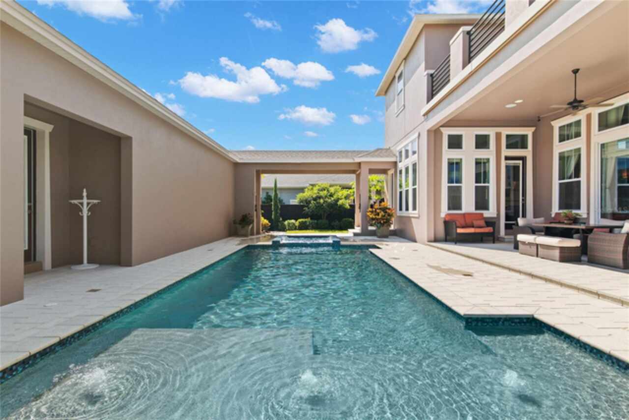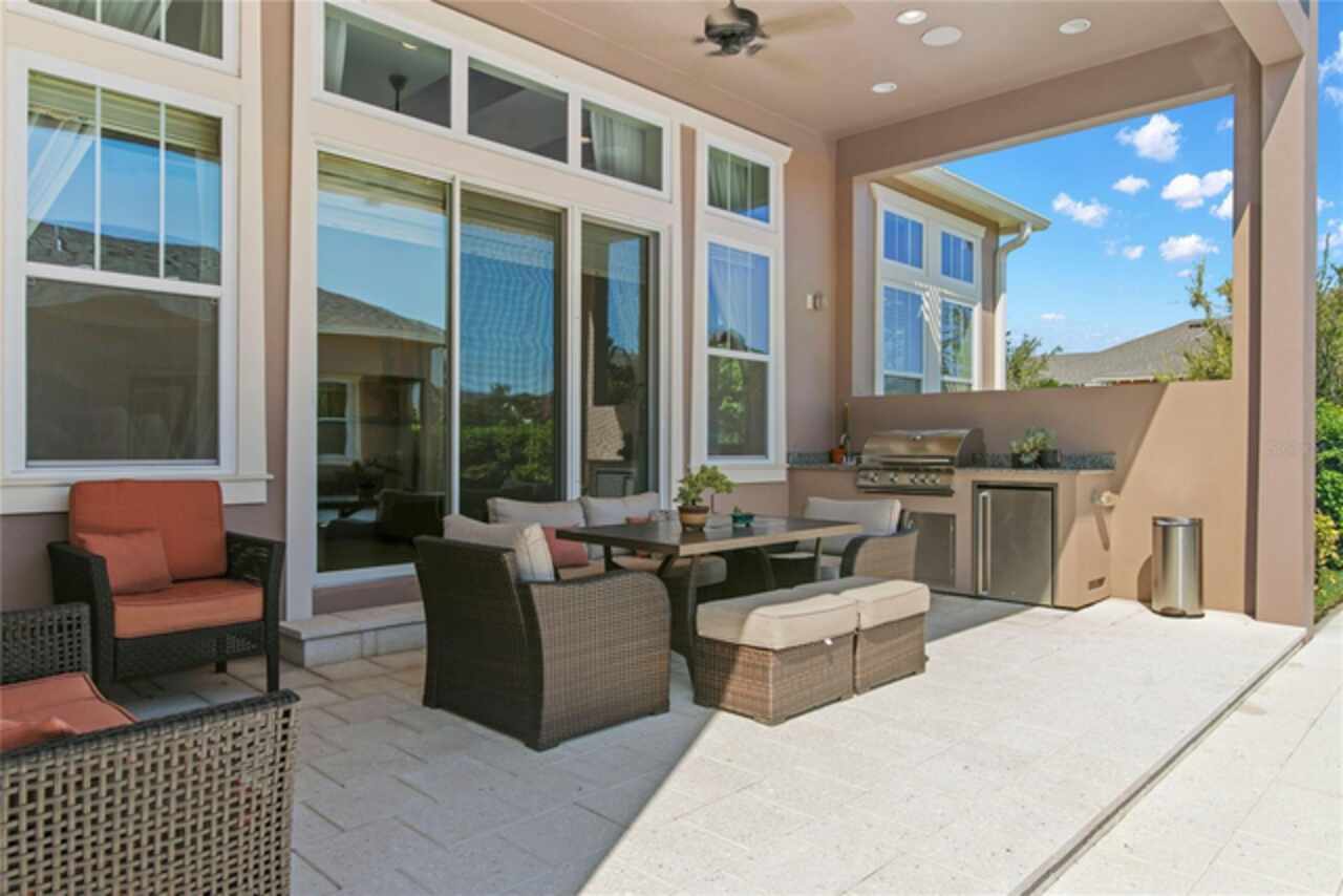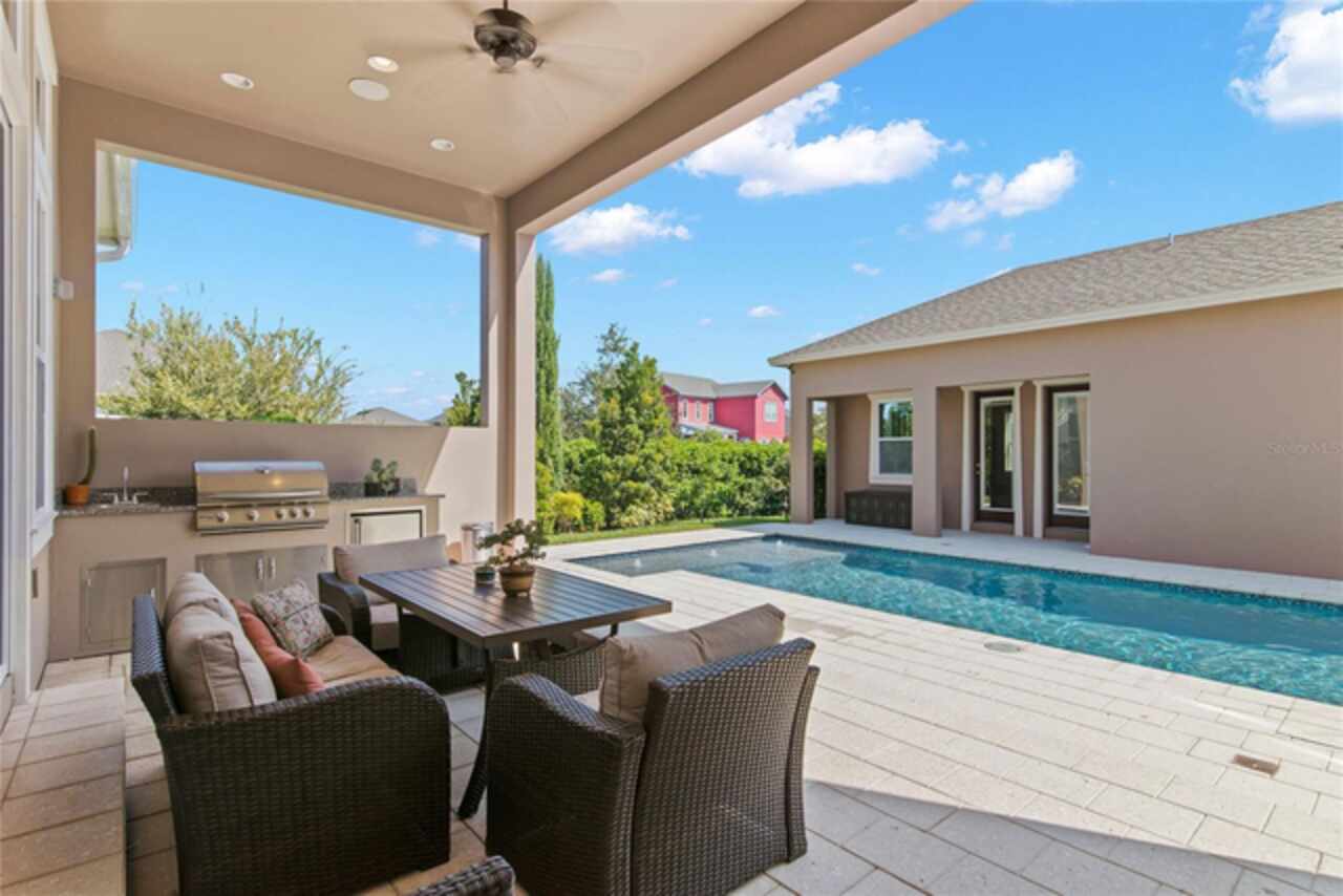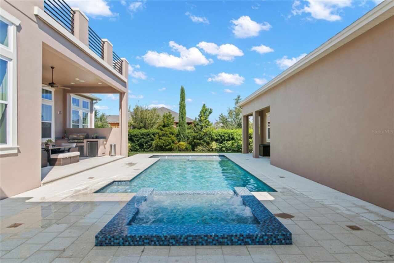 This luxurious estate home in Laureate Park/Lake Nona sits on an oversized corner lot (77 Ft Front) on Square Lake. Enjoy the fantastic views and gorgeous sunsets every day from your own extended covered front porch. Totaling 4, 650 square feet with 5 bedrooms and 4.5 baths, this impressive home features so many high-end upgrades that you feel as though you are living in a model home. From the beautiful porcelain tile on the first floor to the extraordinary wood beams in Formal Living, Great Room, Dining Room and Sunroom, you will see the dedication and love put into this home. The gourmet kitchen features two custom islands, double stack kitchen cabinets, gas appliances, double build-in fridge, butler’s pantry with wine cooler, and a large walk-in pantry. Next to the kitchen is a built-in breakfast nook and built-in mudroom. Many areas of the home have been pre-wired for speakers and a Vivint home security system. The second floor has hardwood floors throughout with the laundry room, 4 bedrooms, and 3 bathrooms upstairs. The spacious primary bedroom features a gorgeous master bathroom and two built out master closets. This home provides multiple options to entertain family and friends - enjoy the views from your large upper terrace or relax in your backyard oasis with covered summer kitchen and a beautiful salt water pool and hot tub along with a pool house/Mother-in-law Suite with full bath. You also have a covered breezeway to a spacious detached 3-car garage. Enjoy the 44 miles of biking, jogging, and walking trails inside the community and all the amenities Laureate Park - aquatic center, fitness center, community garden, tons of parks and green spaces, Fiber Optics 1 GBPS internet and more.