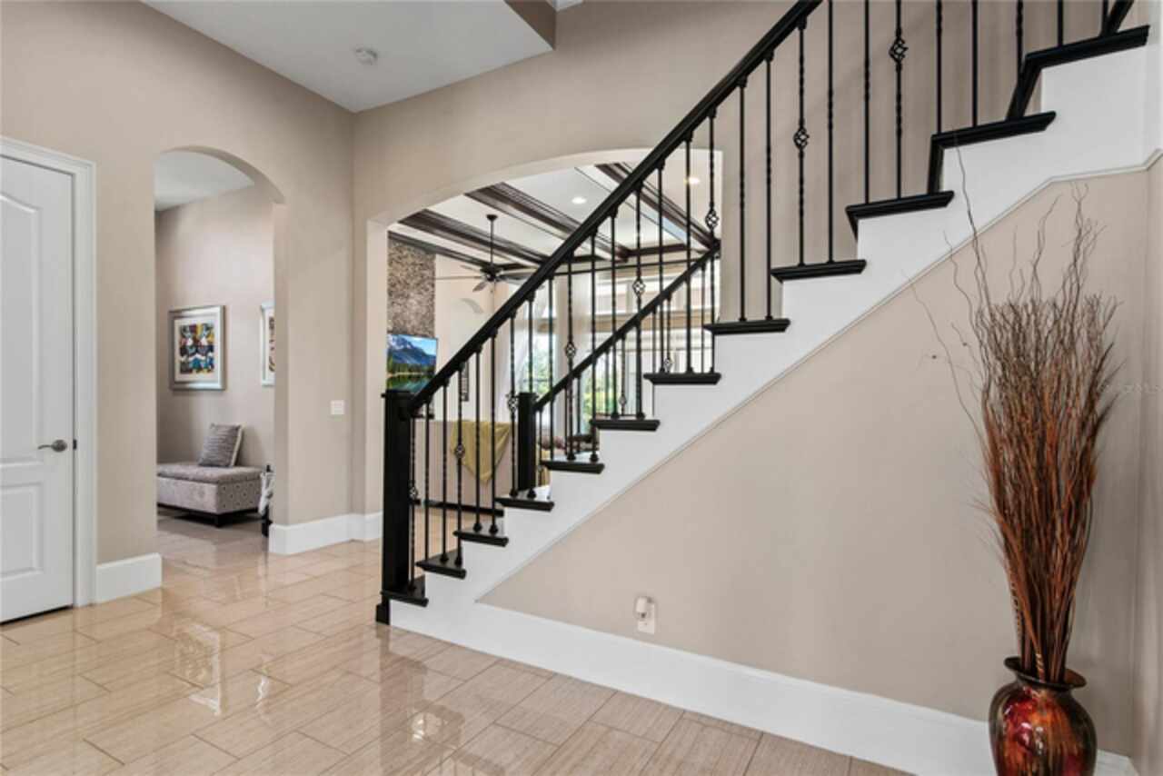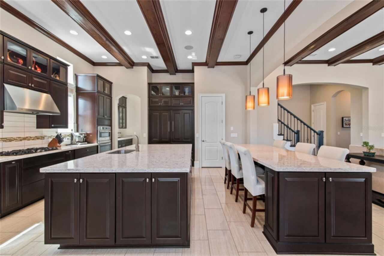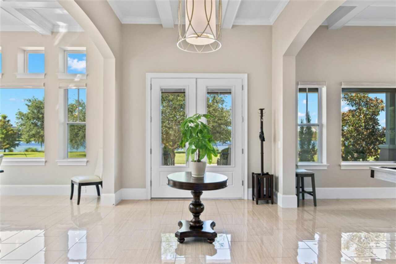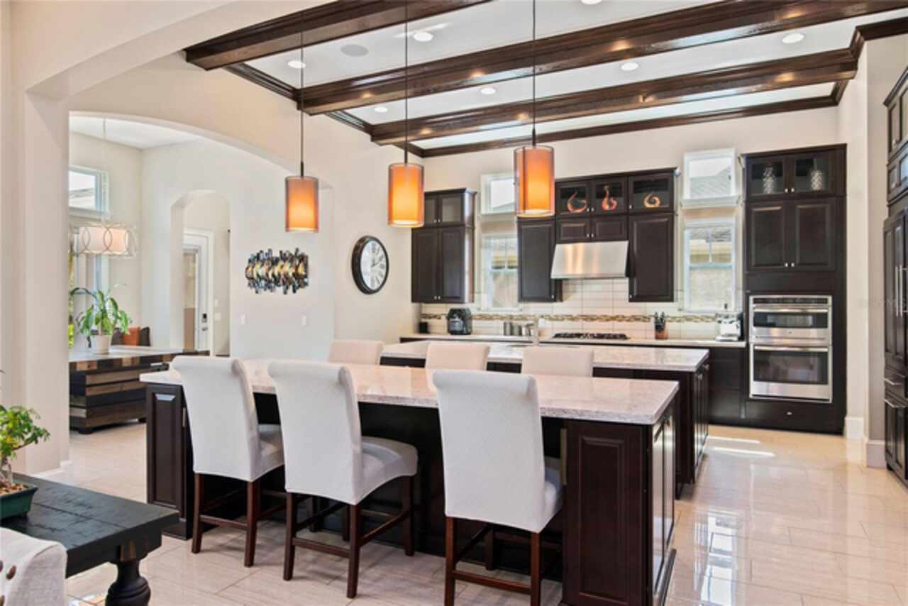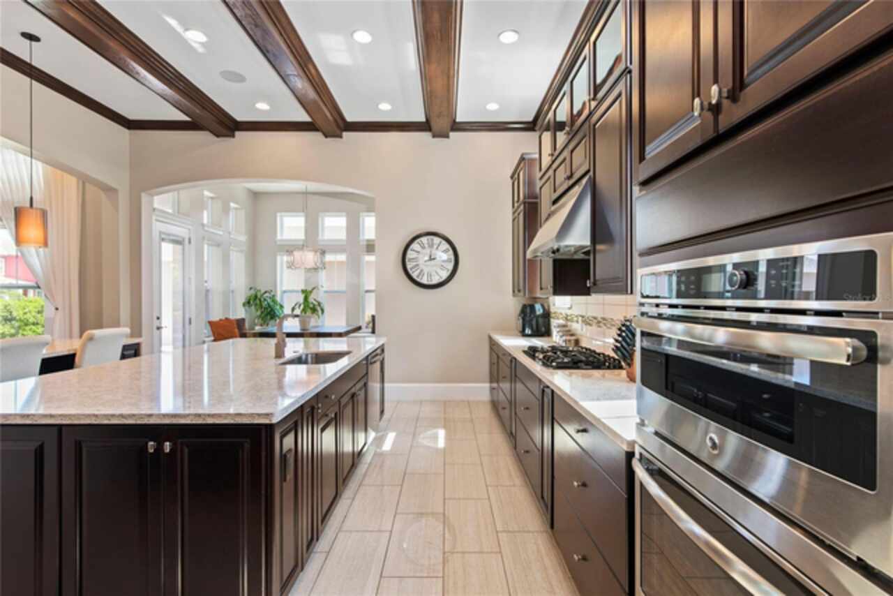 This luxurious estate home in Laureate Park/Lake Nona sits on an oversized corner lot (77 Ft Front) on Square Lake. Enjoy the fantastic views and gorgeous sunsets every day from your own extended covered front porch. Totaling 4, 650 square feet with 5 bedrooms and 4.5 baths, this impressive home features so many high-end upgrades that you feel as though you are living in a model home. From the beautiful porcelain tile on the first floor to the extraordinary wood beams in Formal Living, Great Room, Dining Room and Sunroom, you will see the dedication and love put into this home. The gourmet kitchen features two custom islands, double stack kitchen cabinets, gas appliances, double build-in fridge, butler’s pantry with wine cooler, and a large walk-in pantry. Next to the kitchen is a built-in breakfast nook and built-in mudroom. Many areas of the home have been pre-wired for speakers and a Vivint home security system. The second floor has hardwood floors throughout with the laundry room, 4 bedrooms, and 3 bathrooms upstairs. The spacious primary bedroom features a gorgeous master bathroom and two built out master closets. This home provides multiple options to entertain family and friends - enjoy the views from your large upper terrace or relax in your backyard oasis with covered summer kitchen and a beautiful salt water pool and hot tub along with a pool house/Mother-in-law Suite with full bath. You also have a covered breezeway to a spacious detached 3-car garage. Enjoy the 44 miles of biking, jogging, and walking trails inside the community and all the amenities Laureate Park - aquatic center, fitness center, community garden, tons of parks and green spaces, Fiber Optics 1 GBPS internet and more.