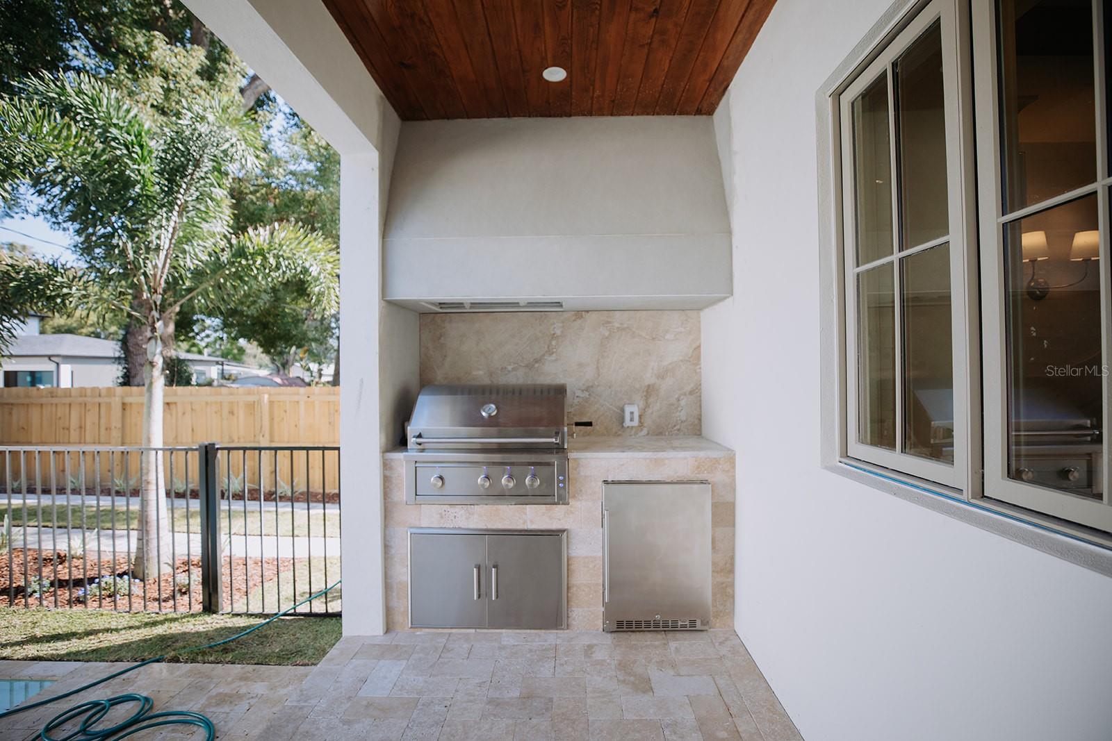 Awning(s), French Doors, Outdoor Kitchen, Rain Gutters, Sidewalk