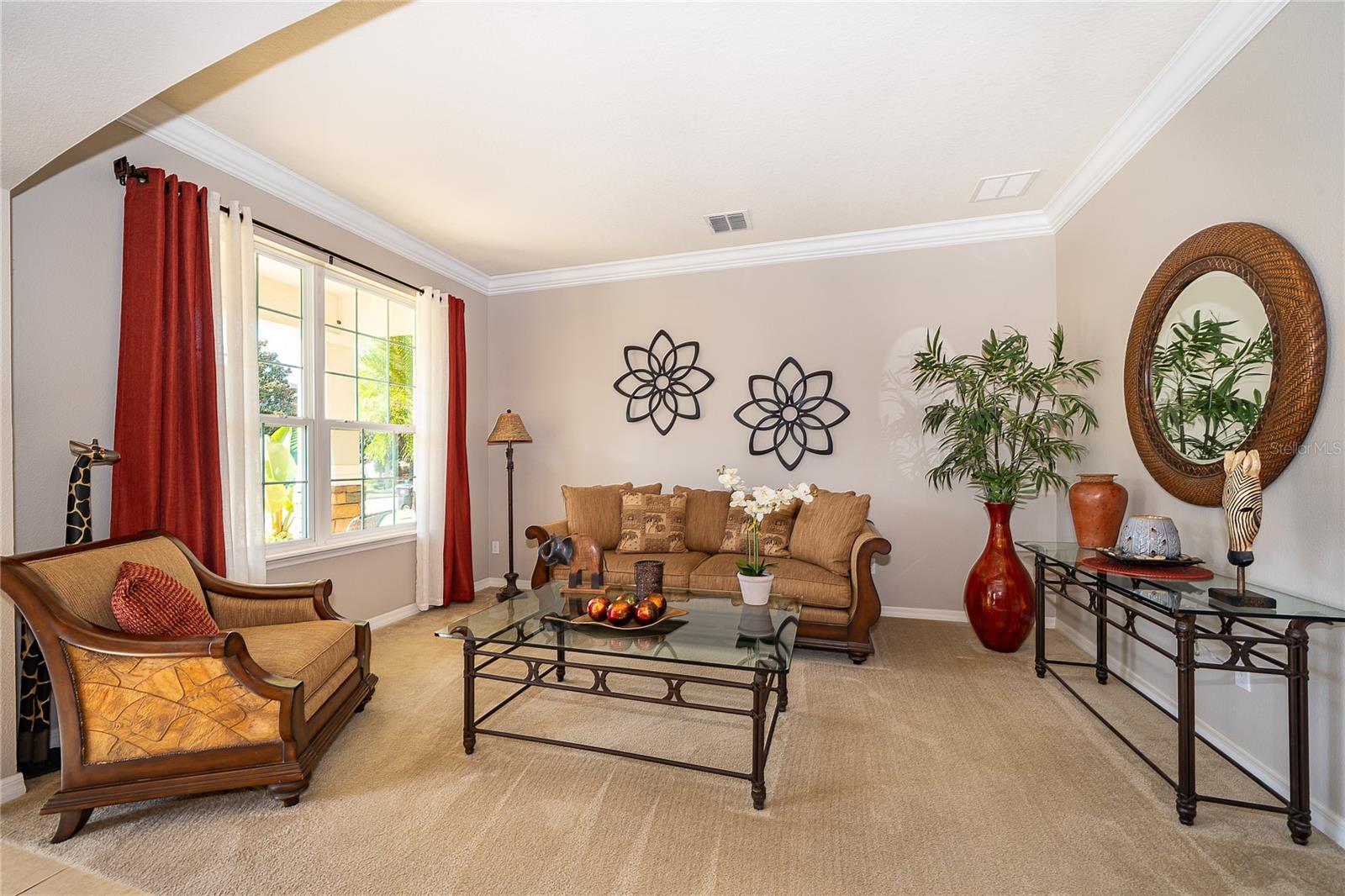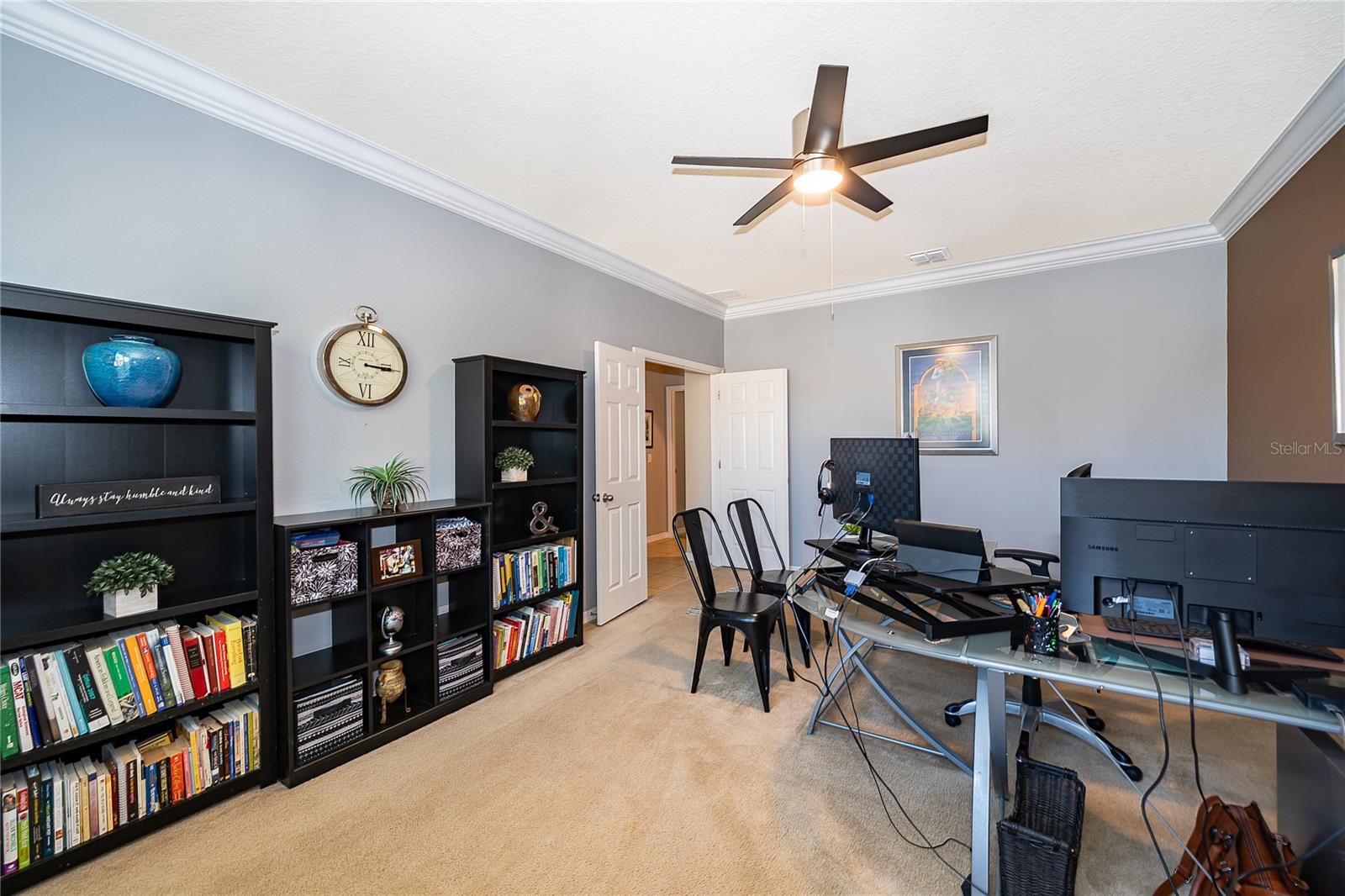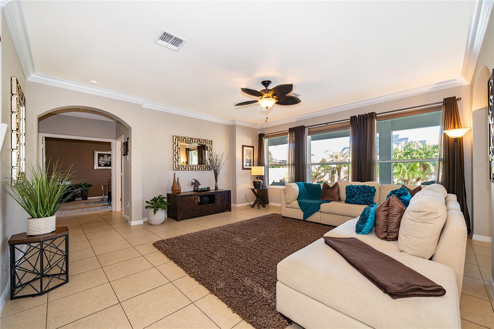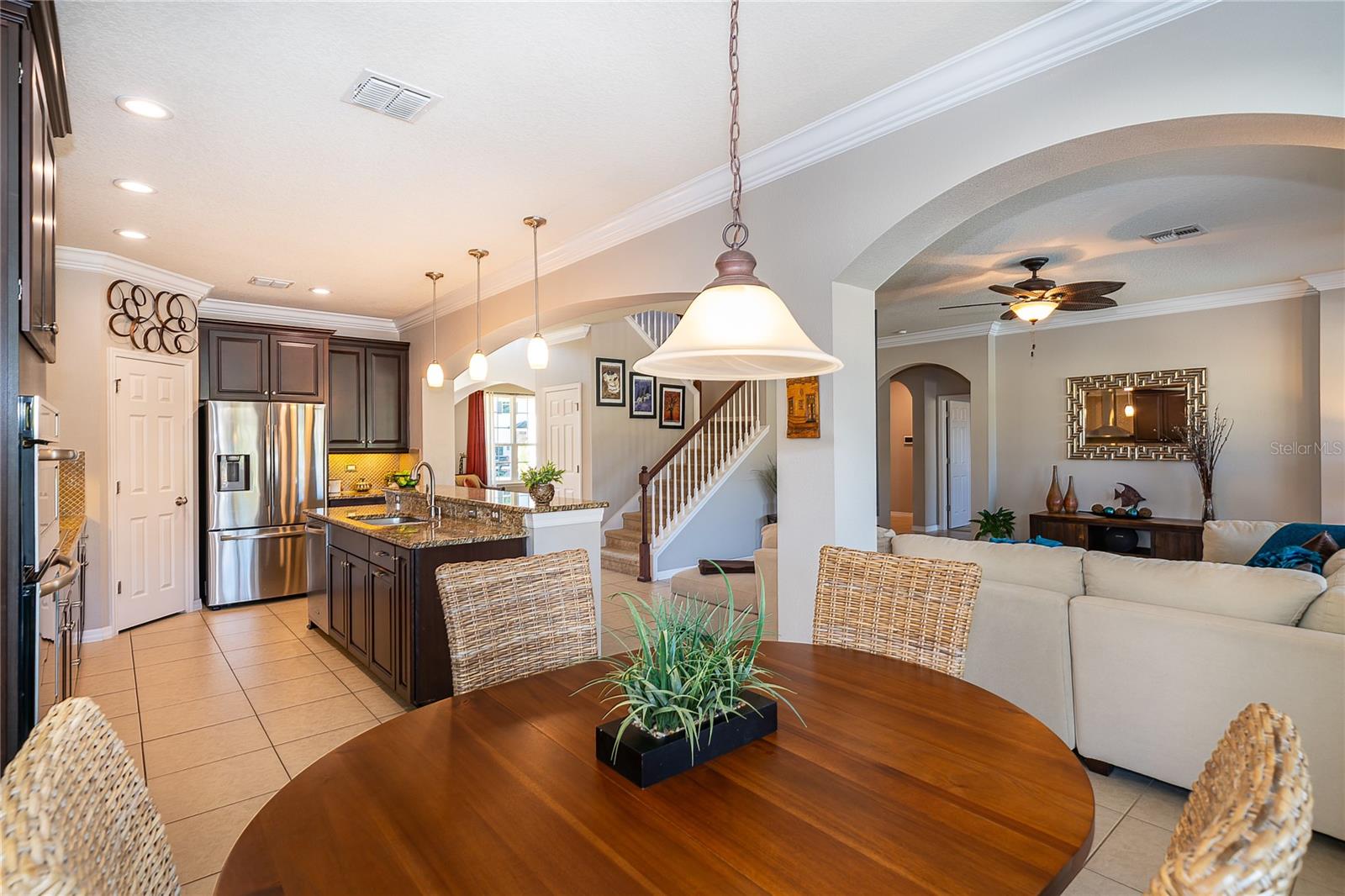 Ceiling Fans(s), Crown Molding, Eat-in Kitchen, High Ceilings, Kitchen/Family Room Combo, Living Room/Dining Room Combo, Open Floorplan, PrimaryBedroom Upstairs, Solid Surface Counters, Solid Wood Cabinets, Stone Counters, Thermostat, Walk-In Closet(s), Window Treatments