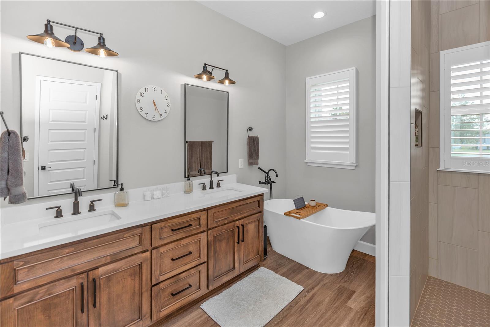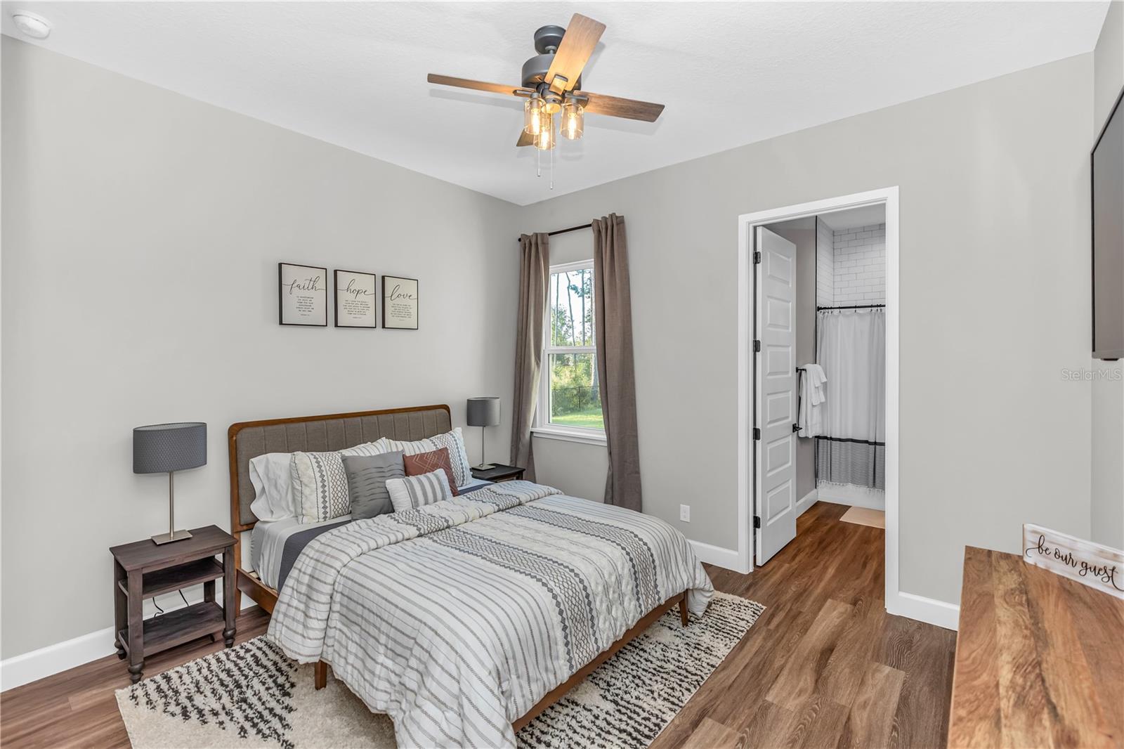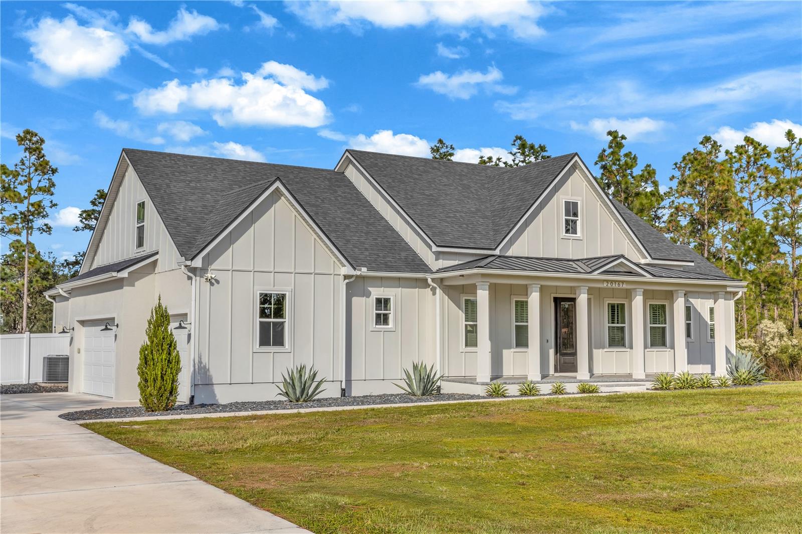 Experience elevated country luxury in this breathtaking custom farmhouse set on 1.24 acres of meticulously manicured grounds, where every detail has been thoughtfully curated for beauty, comfort, and refined living. A stately front patio framed by architectural columns and elegant pavers welcomes you, surrounded by lush, vibrant landscaping that immediately sets a serene tone. Step through the striking faux-wood front door into an entryway that highlights the home’s exceptional craftsmanship and warm design. To the left, a custom-built office features rich cabinetry, glass French doors, and abundant lighting, creating an inspiring workspace with timeless appeal. To the right, a stylish half bath and a coat closet add comfort and convenience. The open-concept living area flows effortlessly into a designer kitchen showcasing quartz countertops, exquisite raised-panel cabinetry, a handcrafted range hood, marble backsplash detailing, and high-end built-in KitchenAid appliances. An oversized walk-in pantry and charming built-in dinette elevate daily living with a blend of elegance and thoughtful functionality. The split floor plan offers outstanding privacy with two spacious downstairs bedrooms, each featuring its own full en-suite bathroom, including one with direct pool access that makes it ideal for guests or flexible living arrangements. The expansive laundry room provides ample cabinetry, a utility sink, and included washer and dryer. Upstairs, a generous loft and a fourth bedroom complete with a full bathroom, walk-in shower, and large attic storage. The primary suite is a true retreat, offering French doors that open gracefully to the pool patio and a spa-inspired bathroom with dual vanities, a freestanding soaking tub, a luxurious walk-in shower, and an oversized custom closet designed to impress. Step outside into your private resort-style oasis where the screened-in lanai features an outdoor fireplace and retractable screens that create the perfect atmosphere for year-round enjoyment. The shimmering pool and integrated spa invite relaxation, while just beyond the enclosure a dedicated fire pit area offers a charming setting for quiet evenings beneath the stars. The fully fenced yard blends both vinyl and metal fencing and provides abundant space for boats, RVs, and outdoor recreation. Additional features include an outdoor shower and a whole-home generator ensuring comfort and peace of mind. With a spacious three-car garage, pristine landscaping, and a captivating blend of timeless farmhouse charm and modern luxury, this extraordinary property delivers an exceptional lifestyle that feels serene and truly one of a kind.