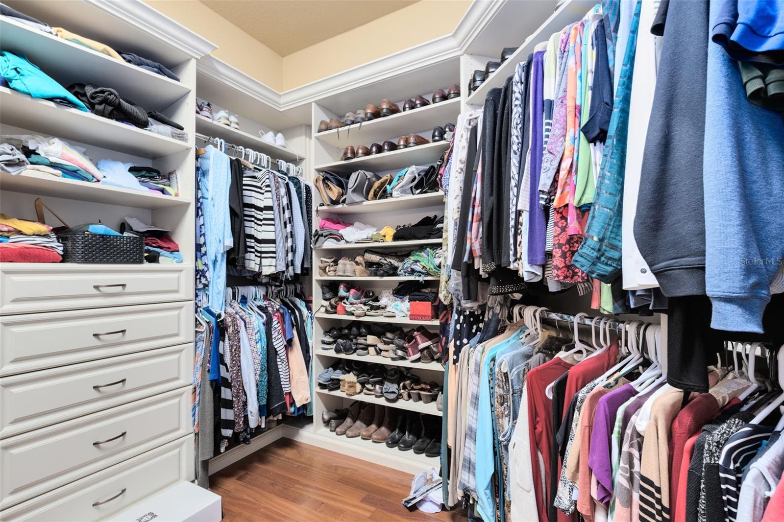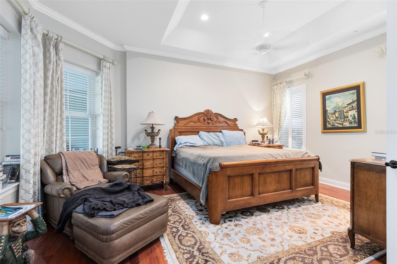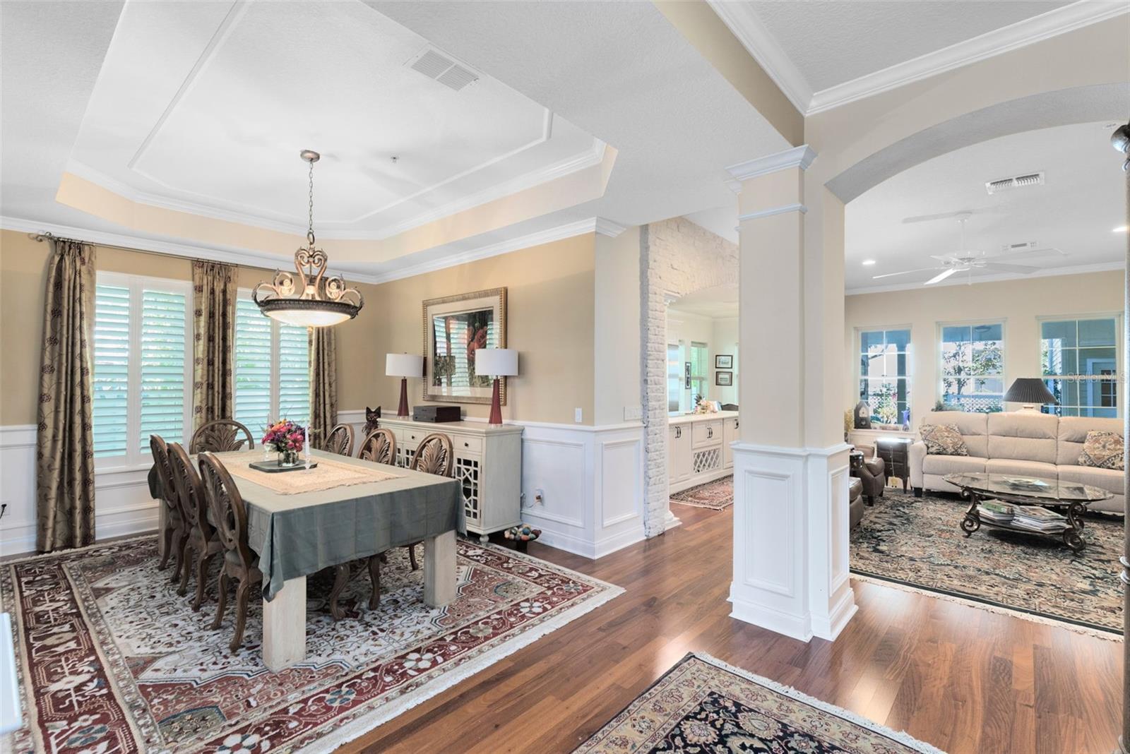 Crown Molding, Eat-in Kitchen, Kitchen/Family Room Combo, Primary Bedroom Main Floor, Solid Surface Counters, Solid Wood Cabinets, Split Bedroom, Tray Ceiling(s), Walk-In Closet(s), Window Treatments