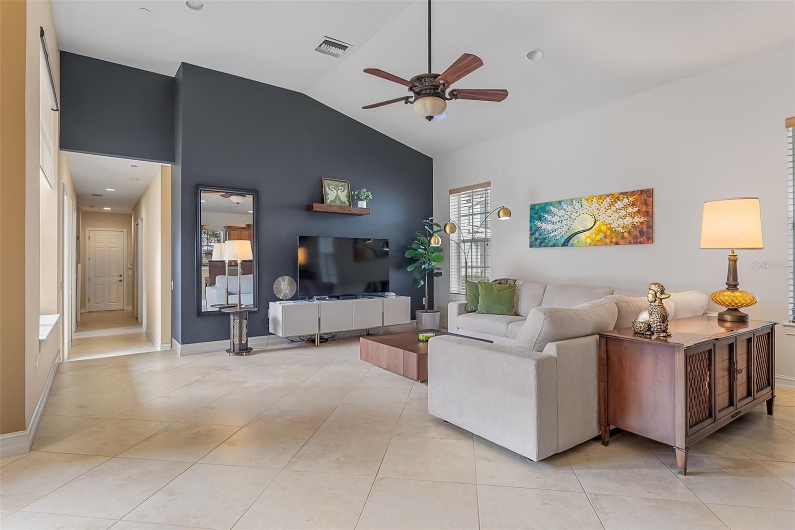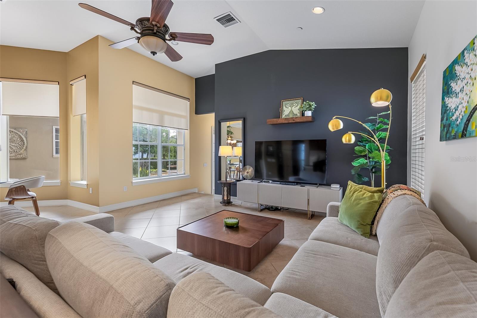 Ceiling Fans(s), Eat-in Kitchen, High Ceilings, Kitchen/Family Room Combo, Open Floorplan, Primary Bedroom Main Floor, Solid Wood Cabinets, Split Bedroom, Stone Counters, Walk-In Closet(s), Window Treatments