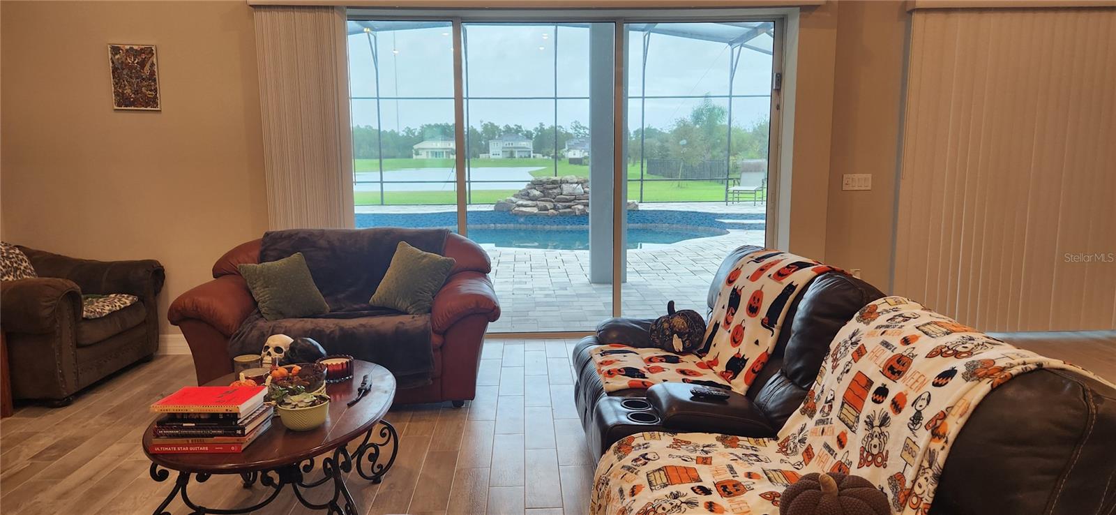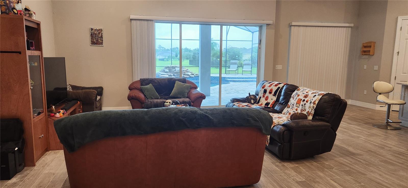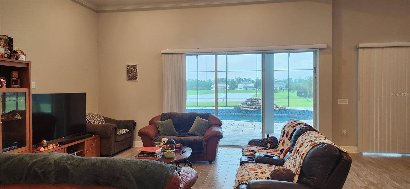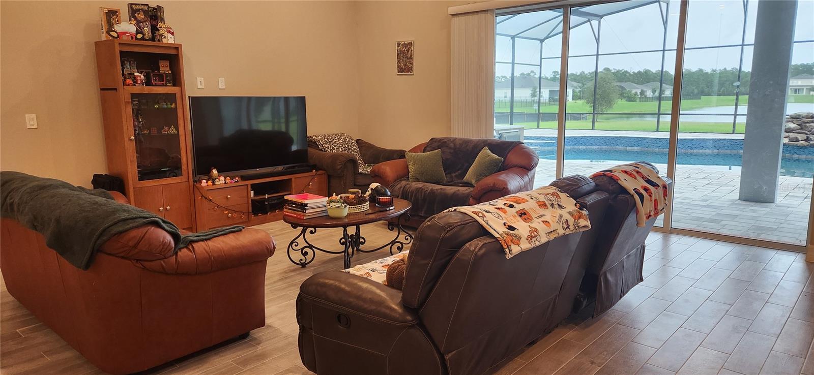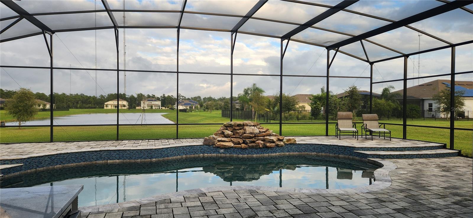 Enjoy this unique one-story single home! custom pool with cascade, enclosed screened patio with a view and a great outside kitchen with mini fridge. The best Florida lifestyle! Full upgraded inside! raised ceiling, luxury cabinet package, top of the line KitchenAid appliances, big size pantry, four bedrooms, three full baths plus full outside bathroom. Large size owners' bedroom, bathroom featuring double sink, shower with rain head and roman tub, large walking closet. Ceramic tile throughout all the house, No Carpet at all! Surround sound system, advance home theater speaker. Warm neutral paint color. 3 car garage with epoxy floors. Laundry room inside. The new community of Sunset Preserve has a private boat dock for their residences into amazing Lake Picket.