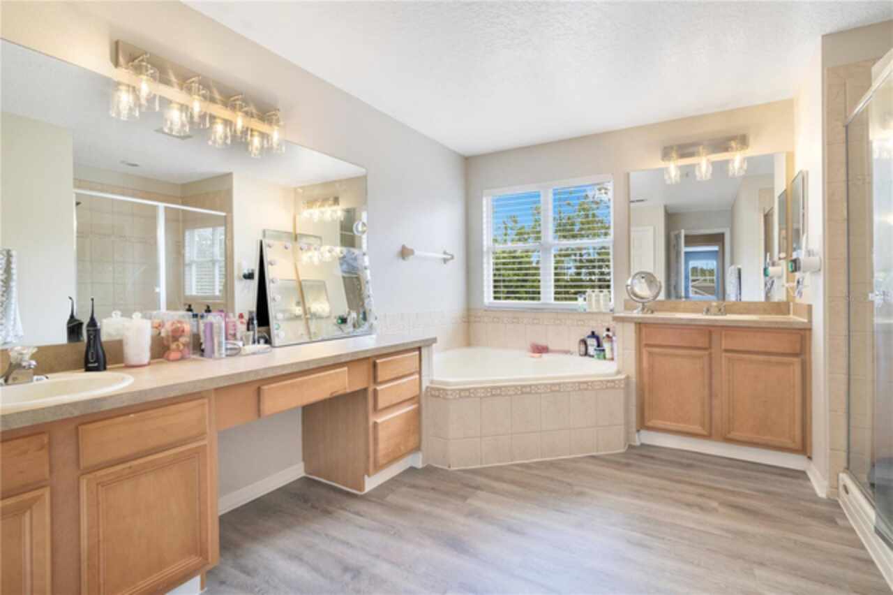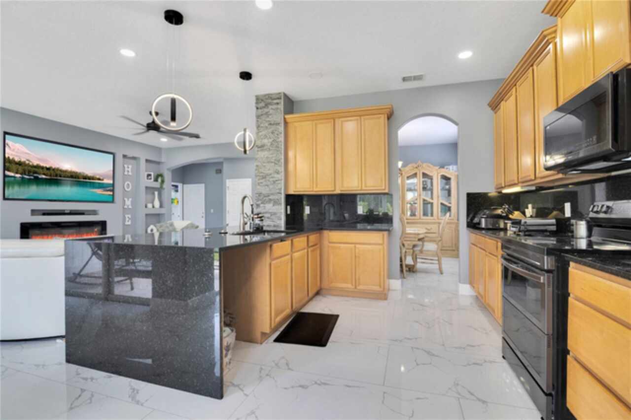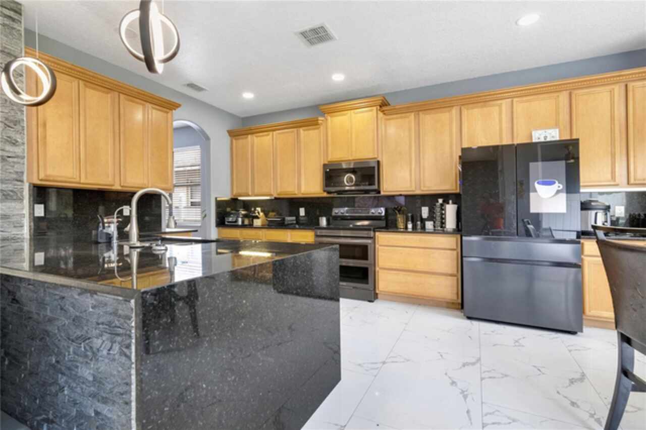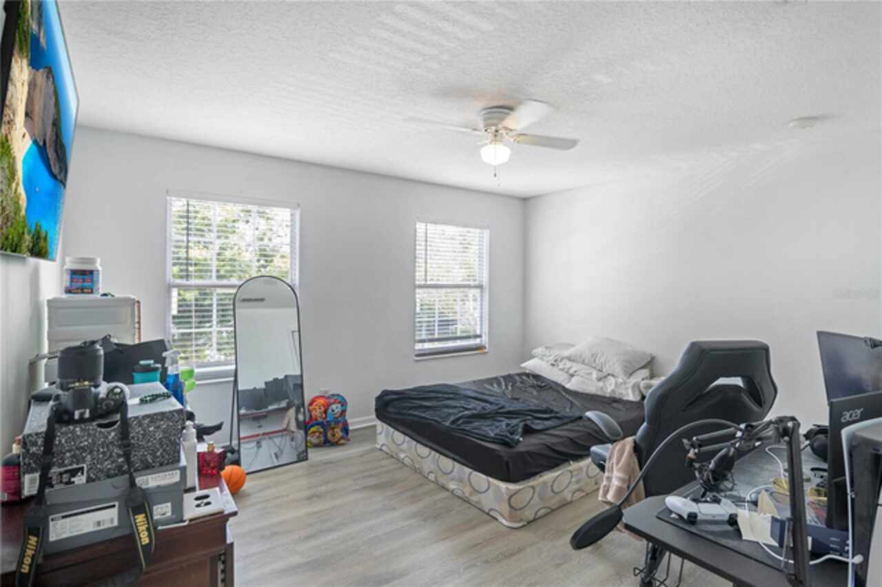 Spacious 5-bed, 4-bath home in Tivoli Woods with over 3, 400 sqft of living space! Enjoy peace of mind with a new roof (Sept 2023) and new AC (Jan 2024). The home features a freshly painted exterior, solar panels for energy savings, and a large open layout with modern upgrades throughout. The kitchen offers granite counters, a sleek island, and tons of cabinet space. Downstairs includes bright tile floors, built-in shelving, a cozy electric fireplace, and an independent bedroom with a private entrance—perfect for a rental, guest room, or mother-in-law suite. Upstairs you'll find roomy bedrooms and a huge primary suite with a spa-style bath. Outside, relax in the side fenced backyard with no rear neighbors, a patio, and a beautiful long trail ideal for walking or running. Great location near MCO, schools, shops, and the parks. Move-in ready!