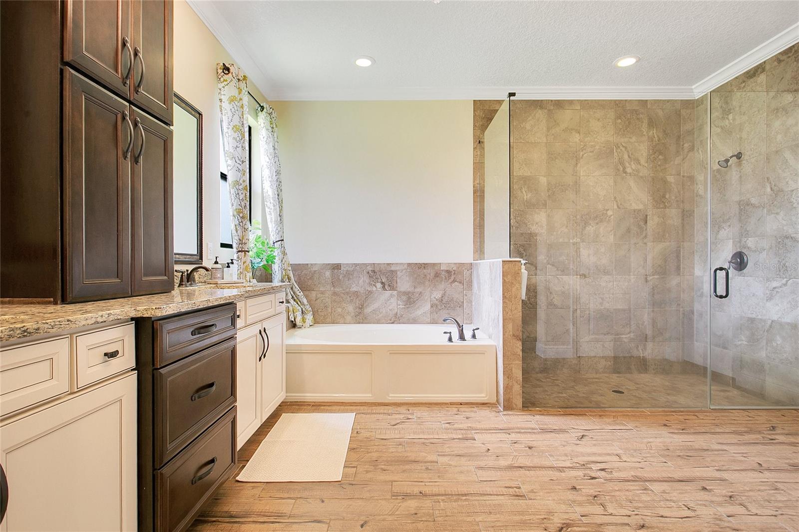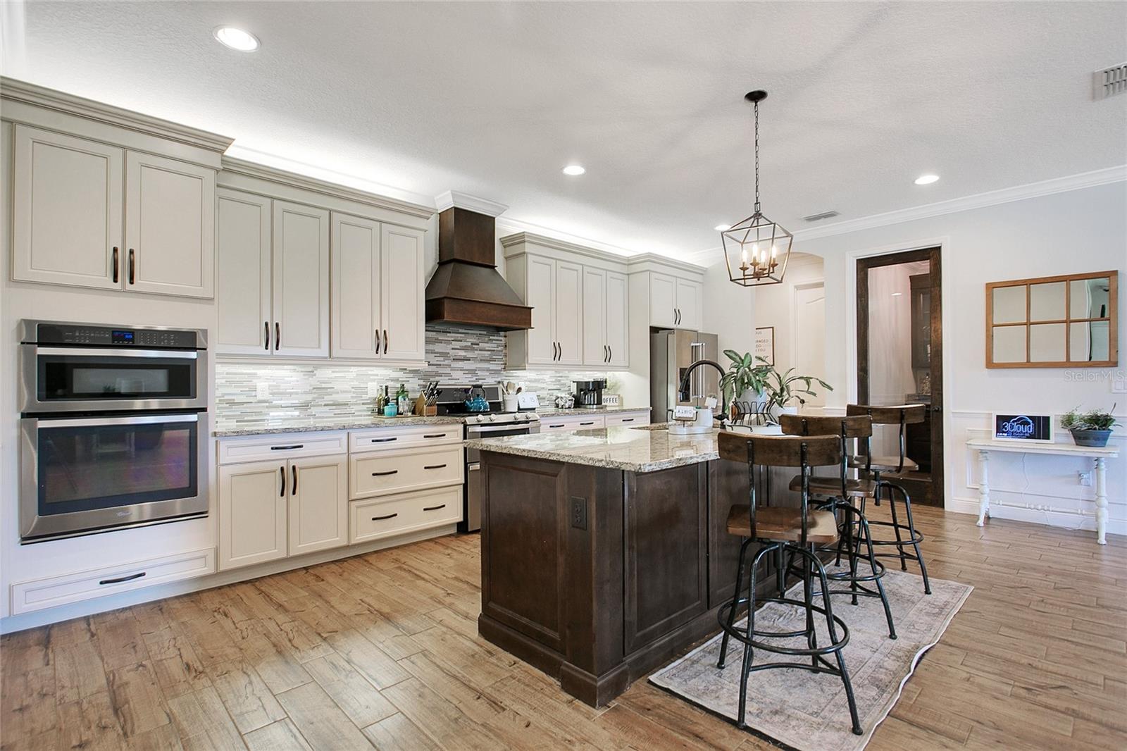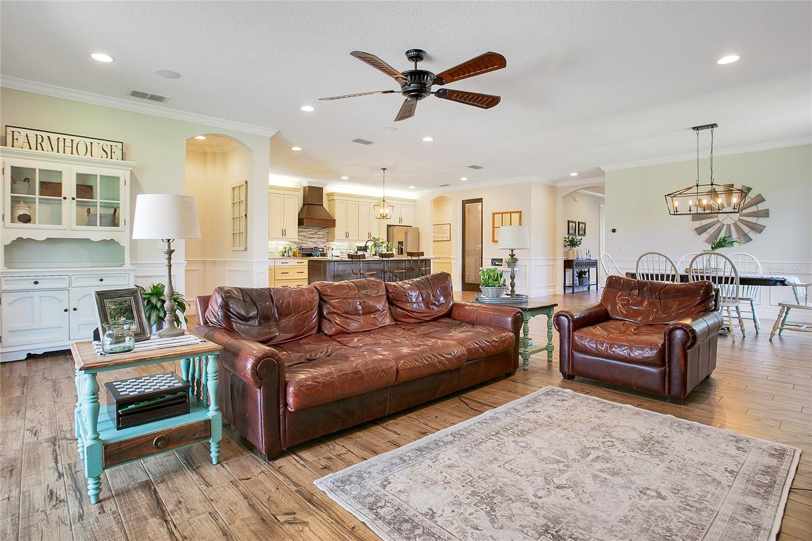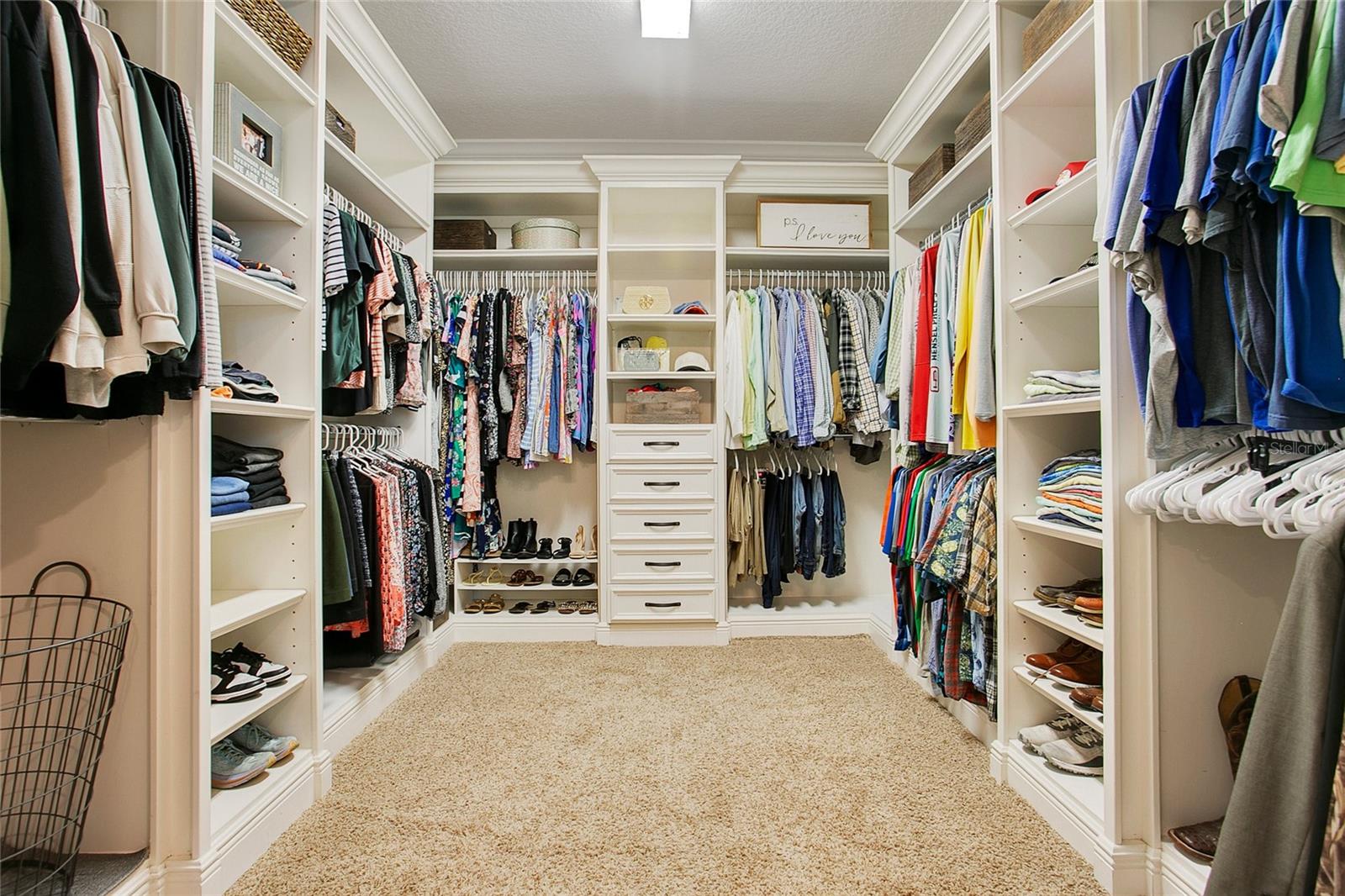 Built-in Features, Ceiling Fans(s), Central Vaccum, Chair Rail, Coffered Ceiling(s), Crown Molding, Eat-in Kitchen, High Ceilings, Kitchen/Family Room Combo, Living Room/Dining Room Combo, Open Floorplan, Primary Bedroom Main Floor, Solid Wood Cabinets, Split Bedroom, Stone Counters, Thermostat, Walk-In Closet(s)