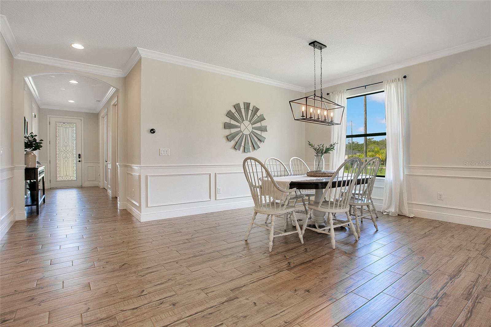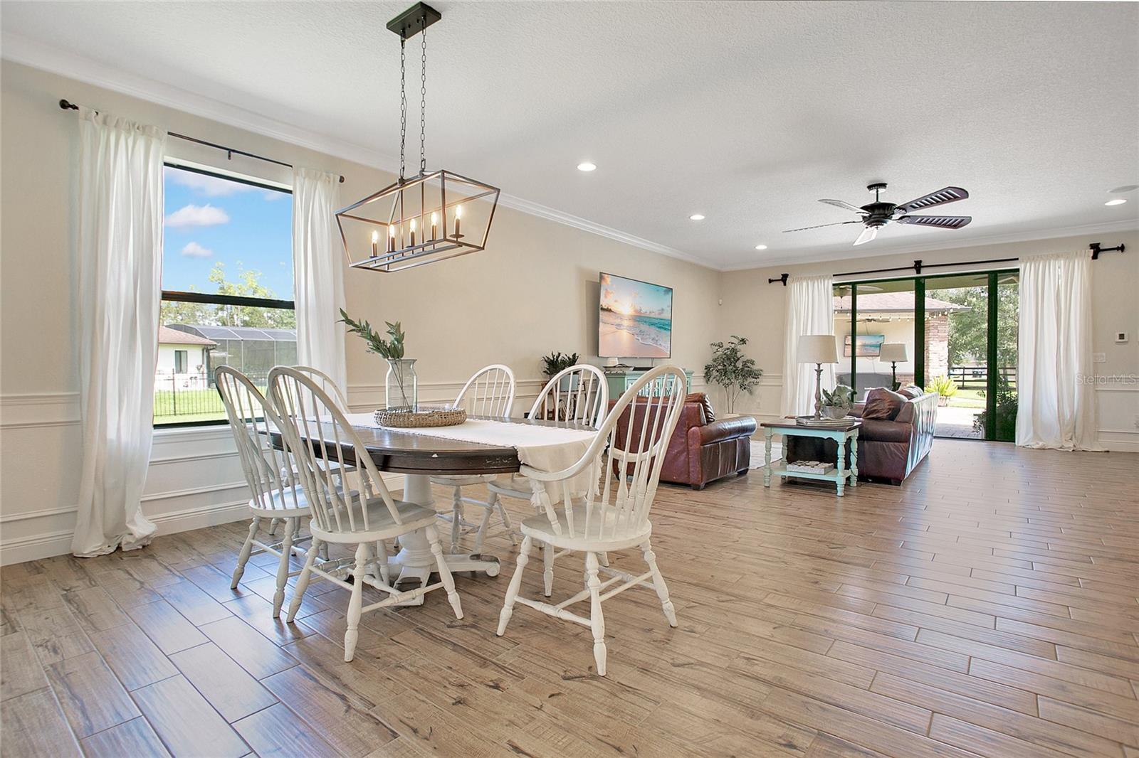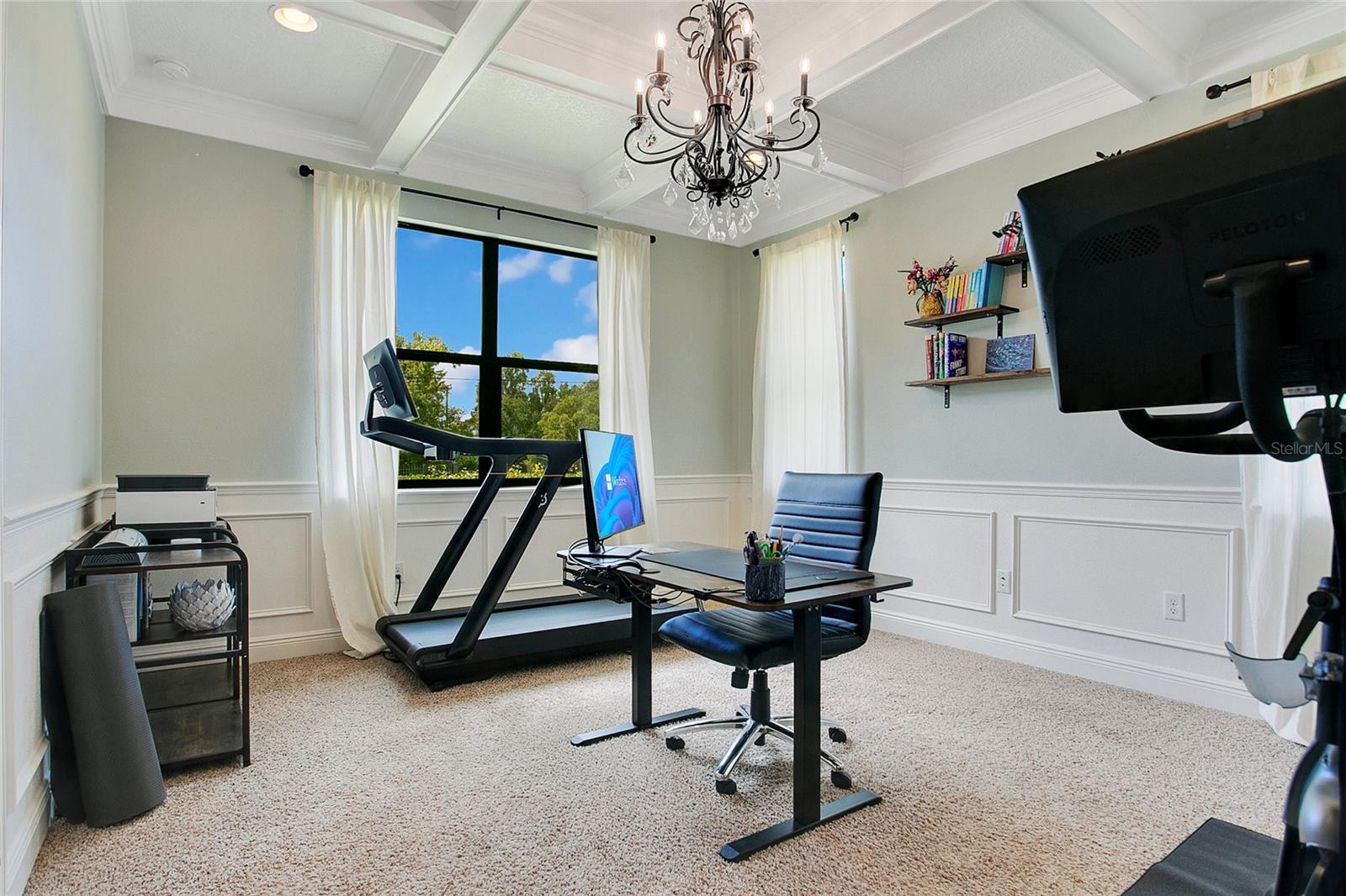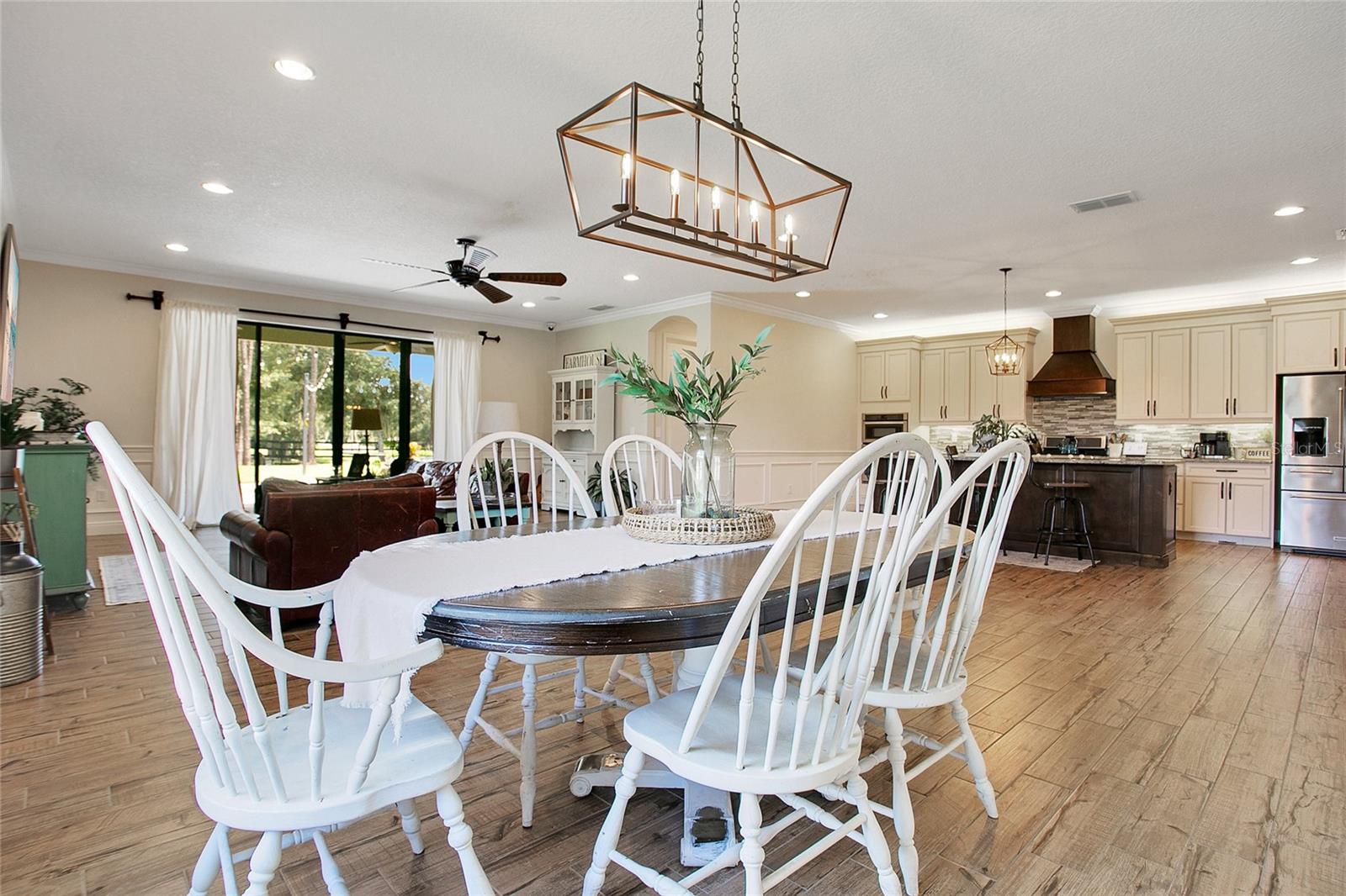 Built-in Features, Ceiling Fans(s), Central Vaccum, Chair Rail, Coffered Ceiling(s), Crown Molding, Eat-in Kitchen, High Ceilings, Kitchen/Family Room Combo, Living Room/Dining Room Combo, Open Floorplan, Primary Bedroom Main Floor, Solid Wood Cabinets, Split Bedroom, Stone Counters, Thermostat, Walk-In Closet(s)