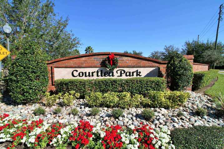 Courtlea Park is a non-gated community located on the North side of East Division Street and the West side of The West Orange Trail. This community has only one entrance and it is clearly marked. There is a large community sign on both sides of the entrance and the street name is Courtlea Park Drive.