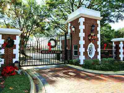 The community entrance is distinguished by a Black fountain and gate with a gold lettered Bentley Park sign. The gate is under video surveillance and there is a camera on the electronic admittance station. The entrance is shaded and discrete but the red brick pavers start to declare that you have arrived at a very special place.