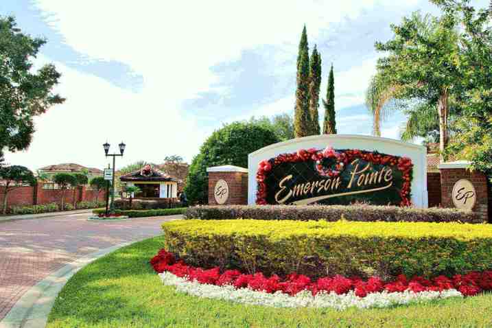 There is only one entrance to Emerson Pointe. The homes here are all luxury high end homes. The homes range in size from 3,200 sf. to well over 8,000 sf. of living area. Some of the finest builders in the Orlando area have built the homes in this neighborhood. In the previous five years homes have sold for prices ranging up to $2,500,000. There are some homes which are not lakefront homes which sell for less. Emerson Pointe Way and Emerington Crescent are the roads most of the lakefront estates are on.