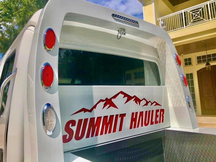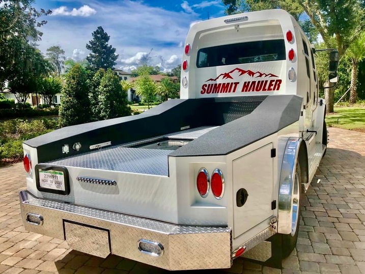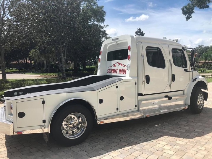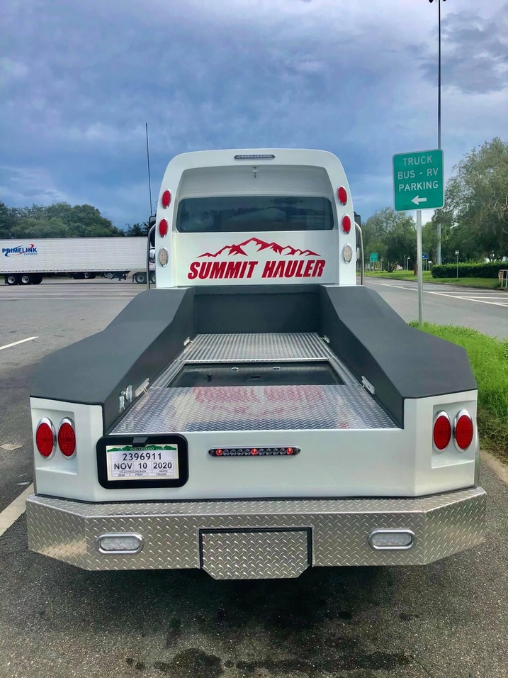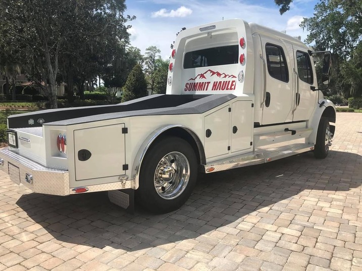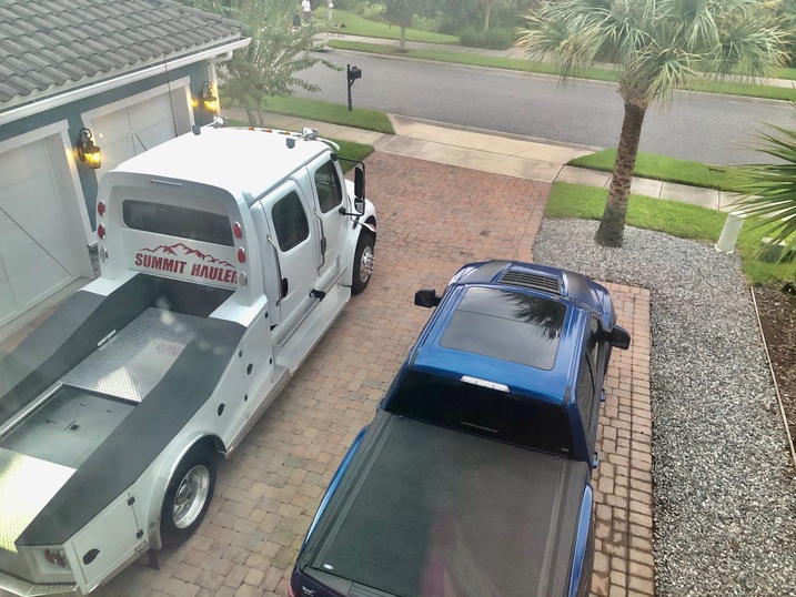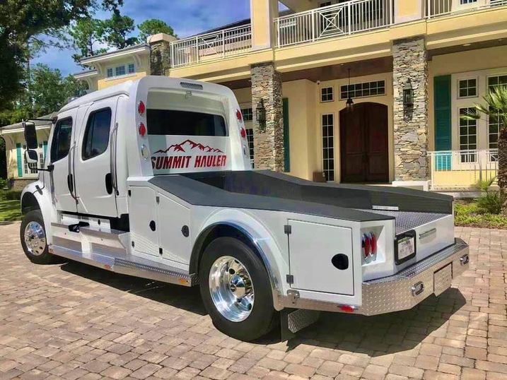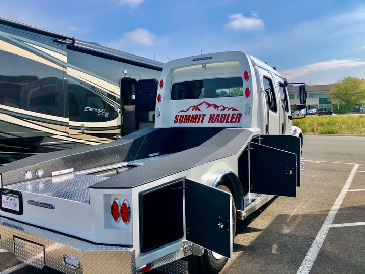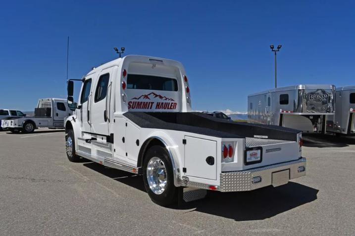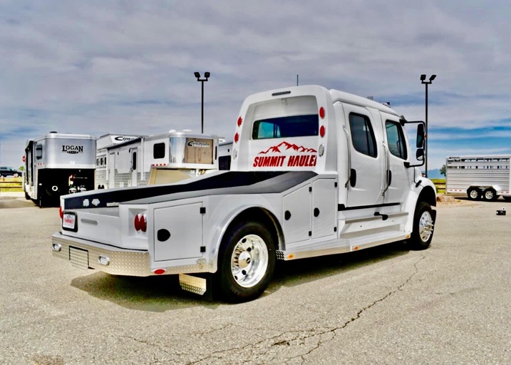 The truck has a 19,500 lbs Gross Vehicle Weight Rating (GVWR), and a towing capacity of about 30,000 lbs. Why choose this Summit Hauler over a new dually pickup truck that has the same or higher towing rating? The bigger class 6 truck offers more heavy-hauling safety. It’s a higher driving position for increased visibility on the highway. It has very powerful air brakes. This is also a truck built for longevity. It does not require any major overhaul until about 500,000 miles.