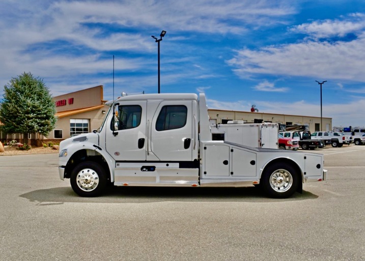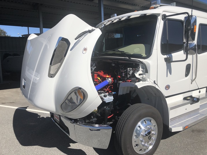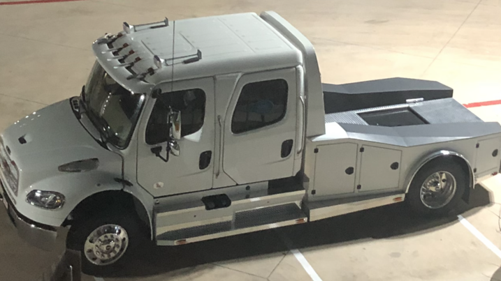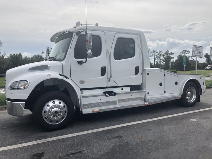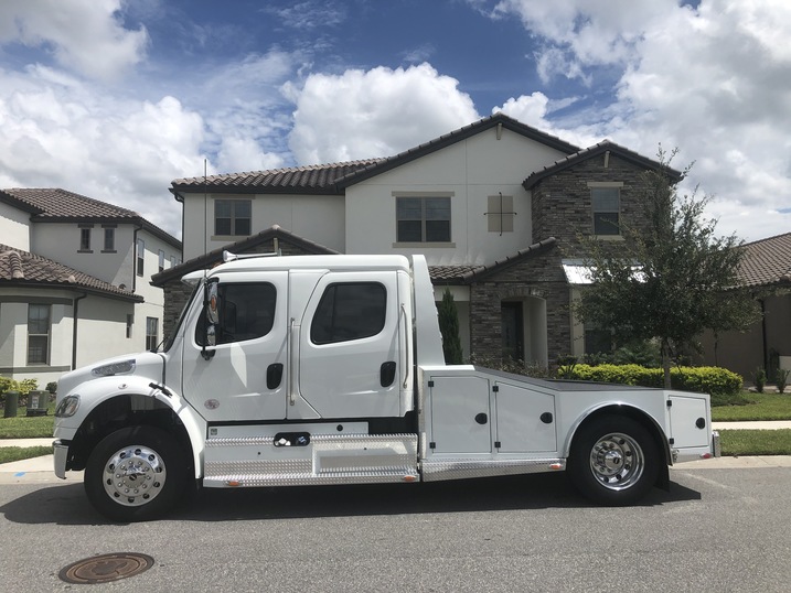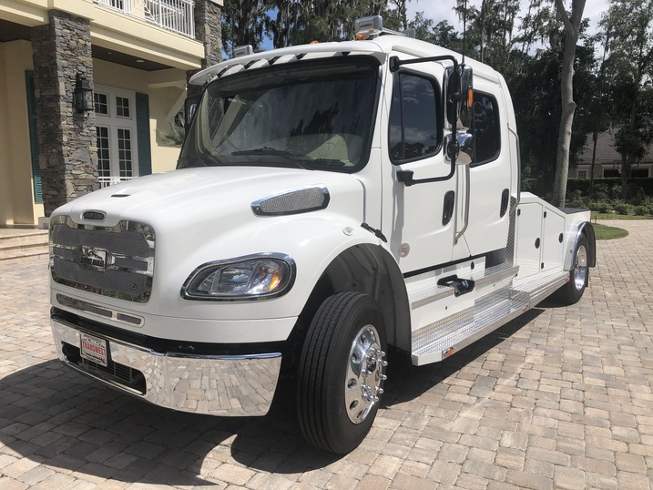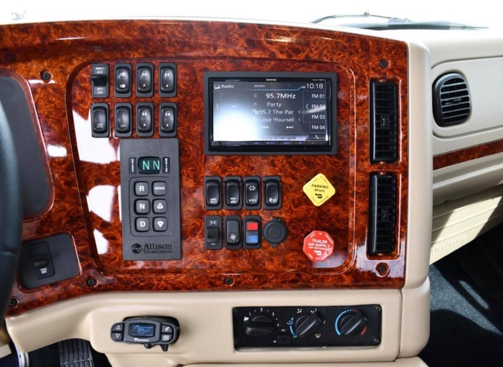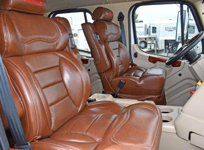 This rig starts as a Freightliner M2 business class crew cab chassis.TransWest takes over and turns it into this luxurious hauler.Under the clam shell hood this truck has a Cummins 8.9L ISL turbo-diesel that is rated at 350 horsepower and 1,150 lb-ft of torque and is mated to a stout 3200 series 6-speed Allison automatic transmission. This transmission is much more heavy duty than the 1000 series you can find in current GM HD pickup trucks.