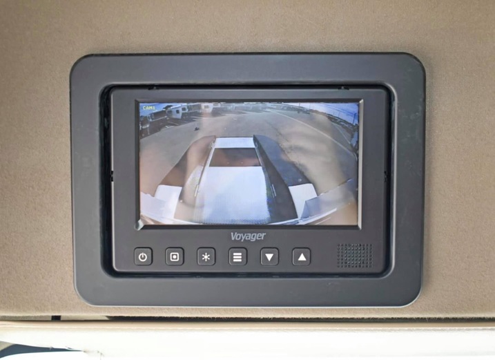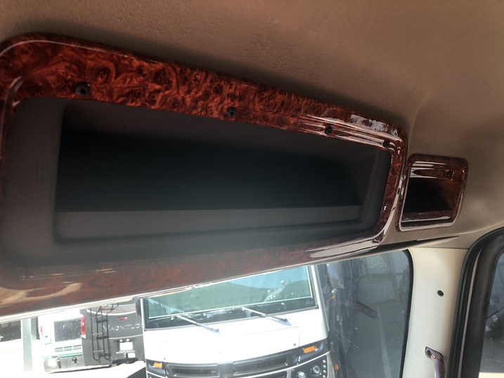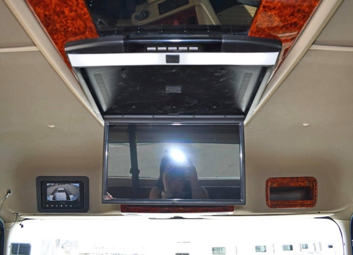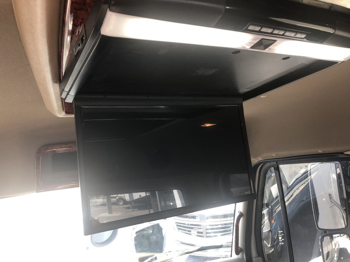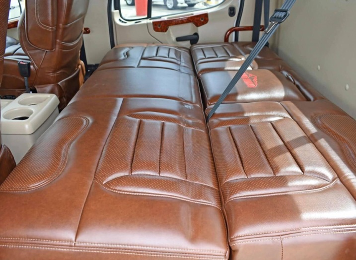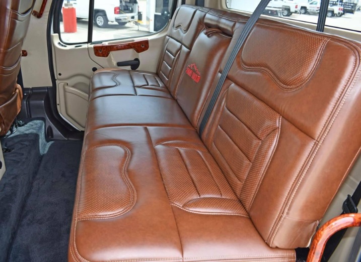 On the inside, it’s soft leather and a folding rear seat that turns into a bed. There is also a navigation system with Apple Play and a way to monitor several cameras around the truck. Rear has DVD TV screen and wireless headphones