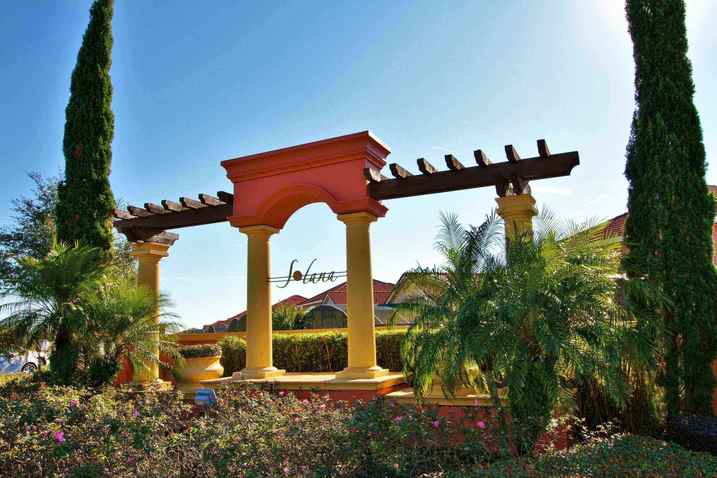 Solana Resort in Davenport FL is a community often referred to as Solana in Orlando Florida the community is close to Orlando but actually in Davenport. The primary entrance is clearly marked and is located on Barry Road about 6.3 miles from Disney. This is a guarded and gated community.