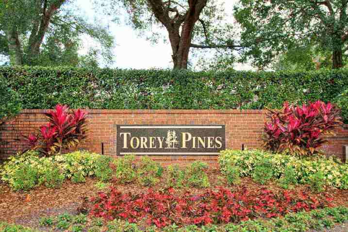 Torey Pines’ entrance can be found on the Eastern Side of S. Apopka Vineland Rd. ¾ of a mile South of Conroy Windermere Rd. There is only one entrance on S Apopka Vineland Rd. and there are small signs on each side. There is a traffic light at the entrance.