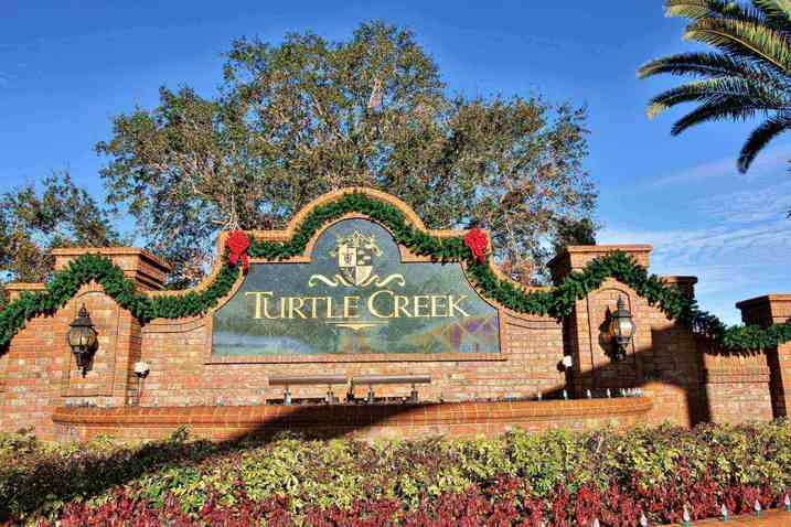 Turtle Creek is in Dr. Phillips which is a highly esteemed portion of Orlando Florida. The only entrance to the community is on the West side of S Apopka Vineland Rd directly across from Buena Vista Woods Blvd. The neighborhood is easy to notice because of the large red brick entrance ang guardhouse.